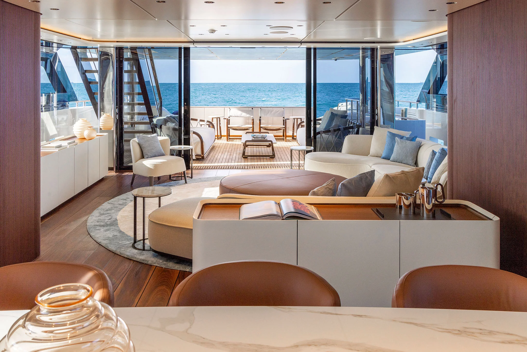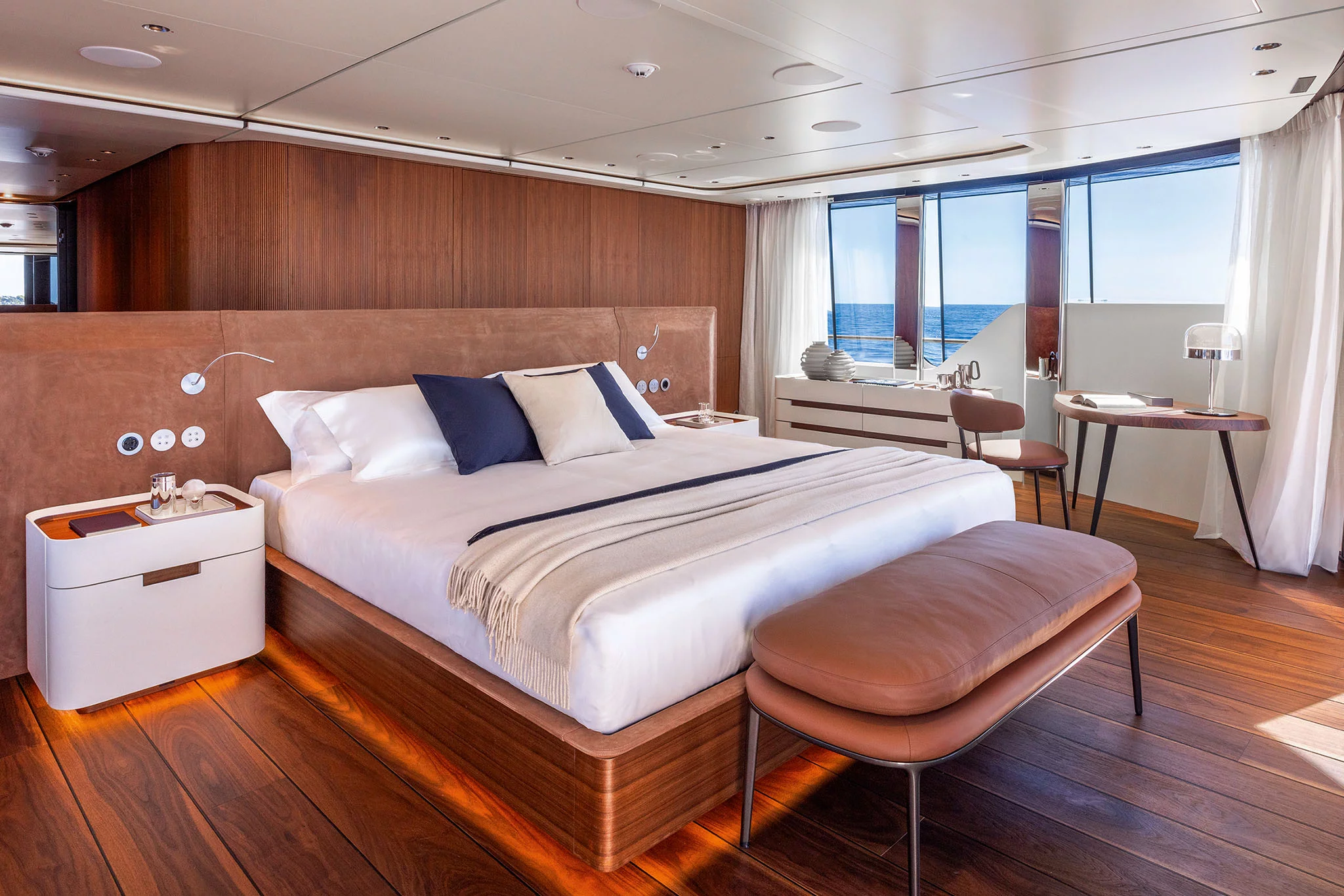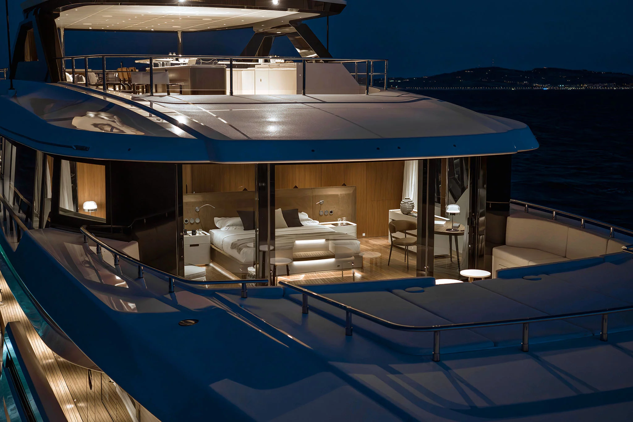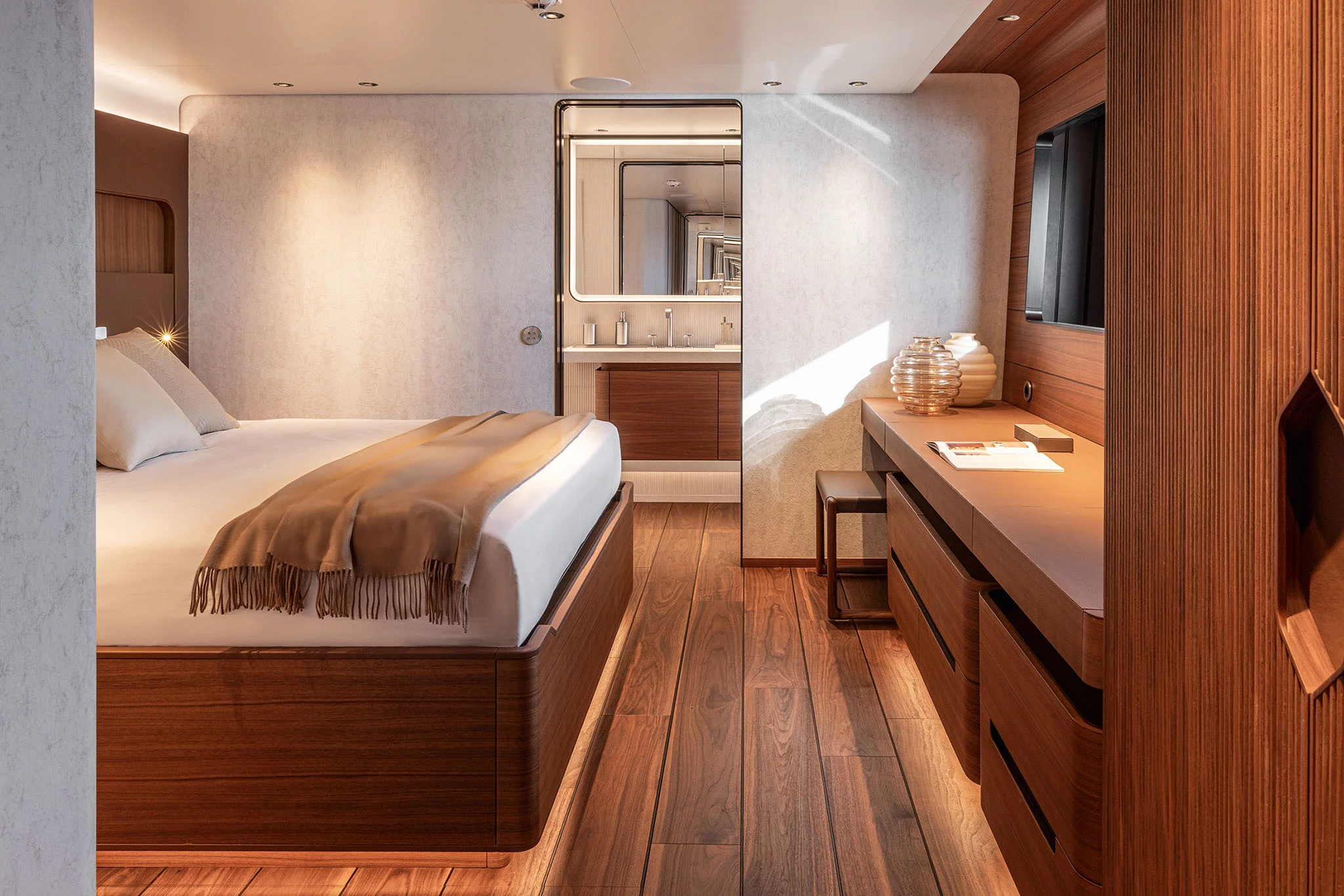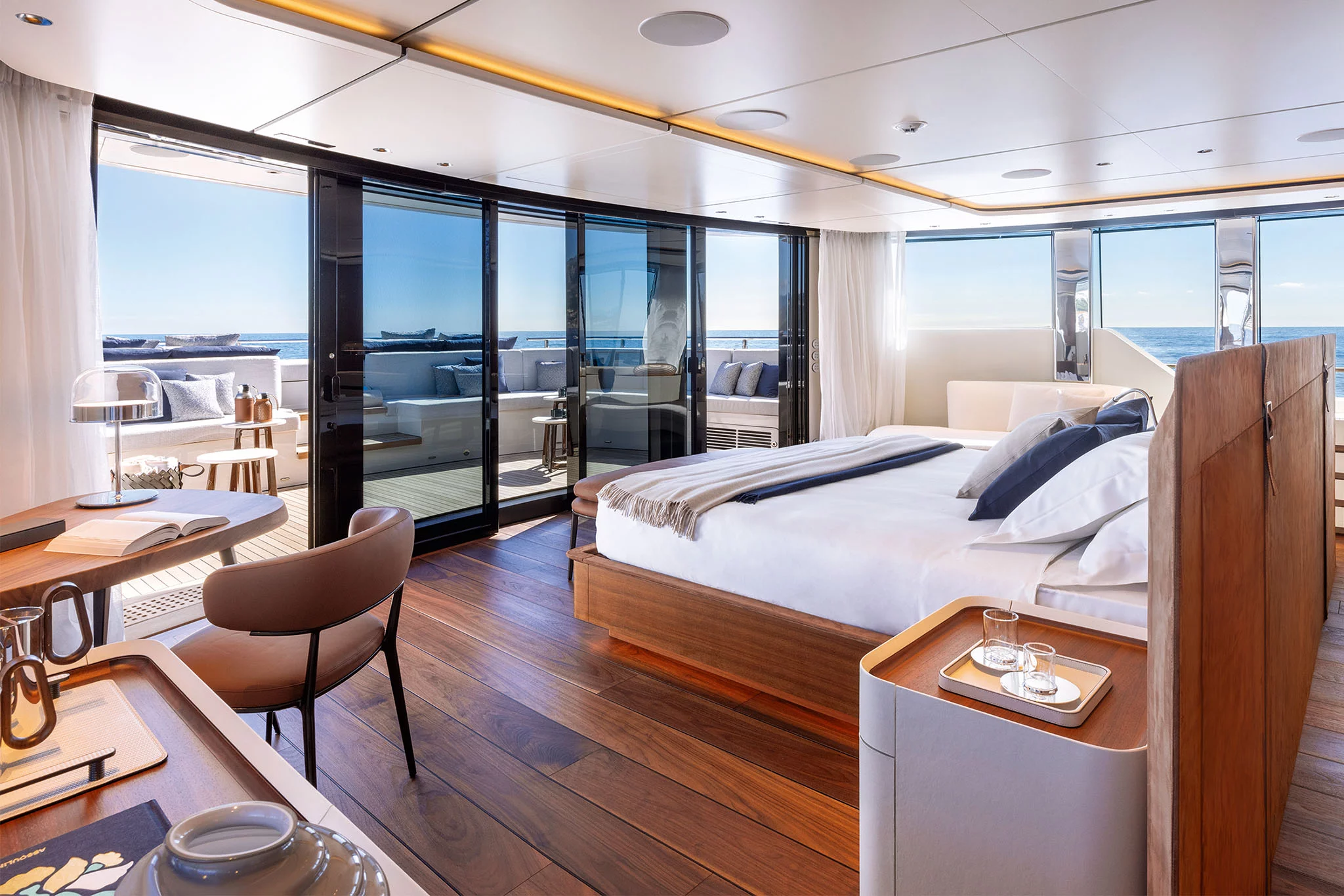 Spread across four decks, the Navetta 50 offers a master suite located at the bow of the upper deck, surrounded by floor-to-ceiling windows that provide 180-degree panoramic views and direct access to a spacious private terrace with a sundeck. The interior and exterior spaces are seamlessly connected, creating bright and open areas that enhance onboard comfort.