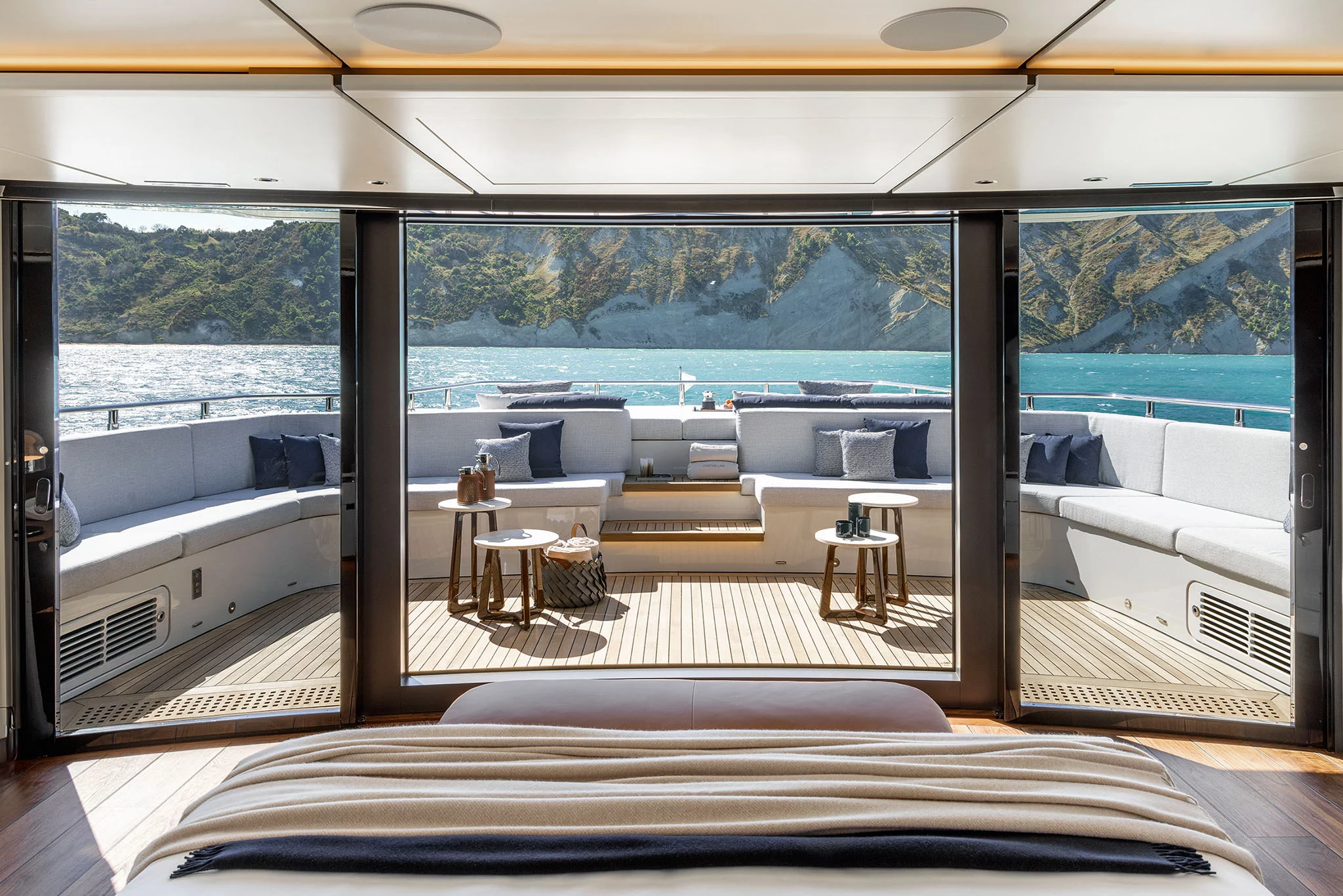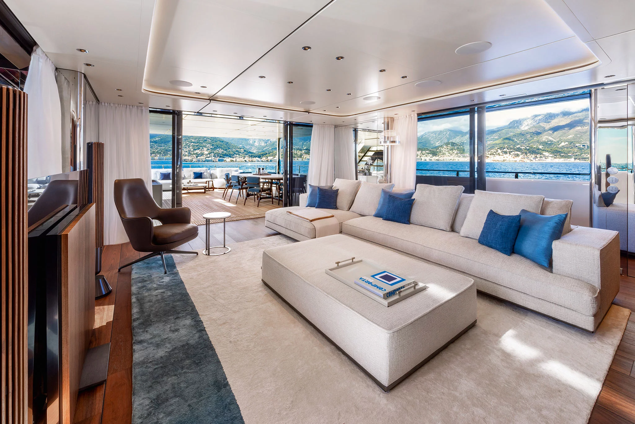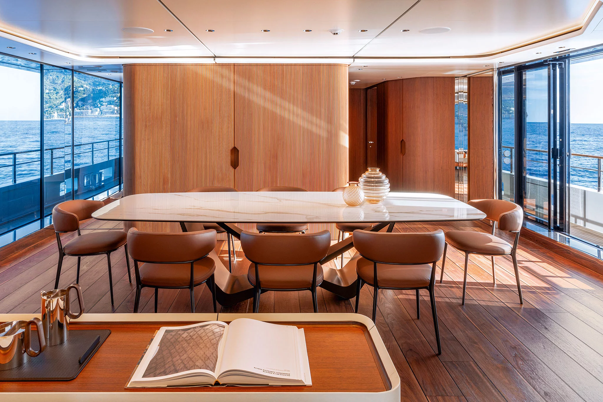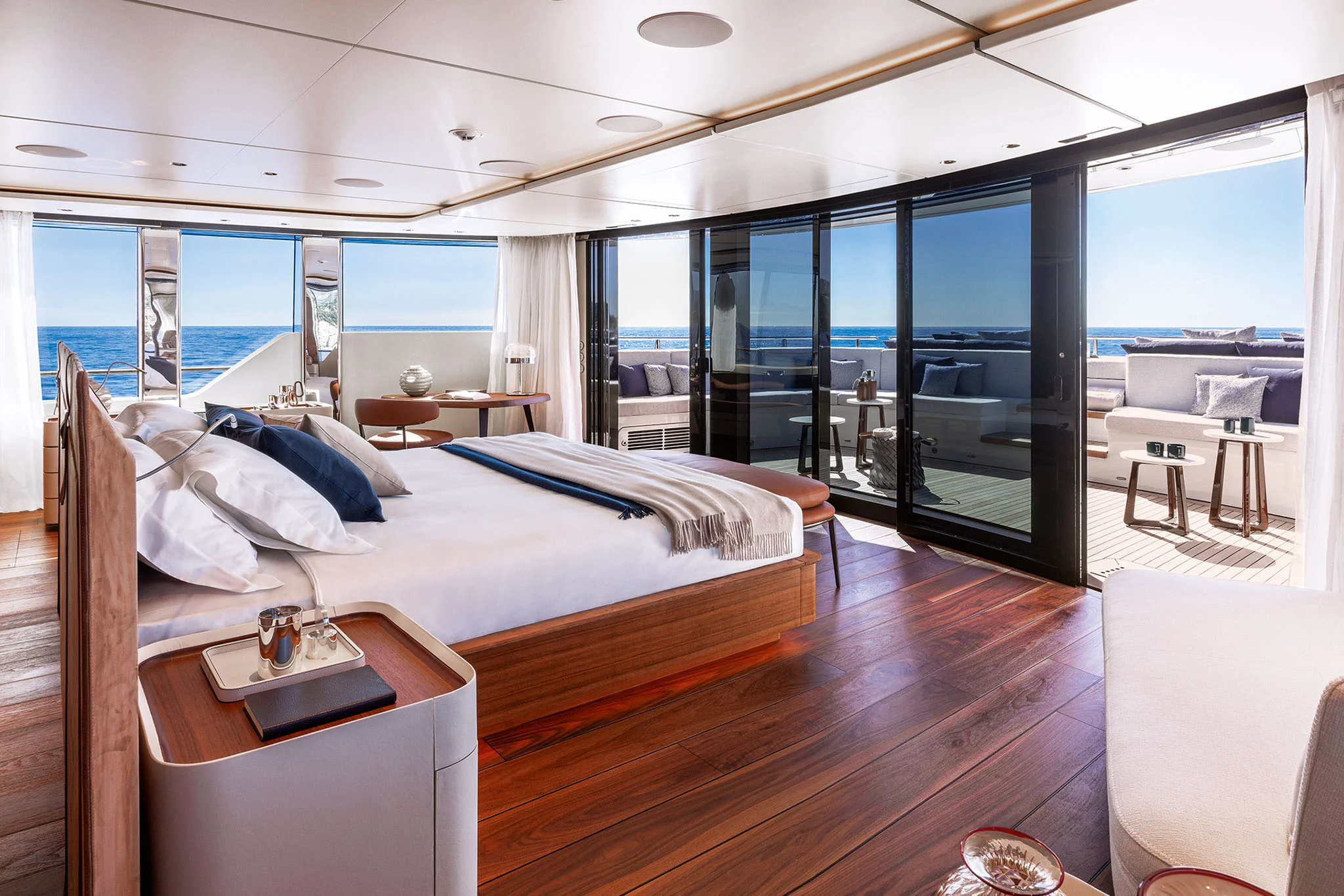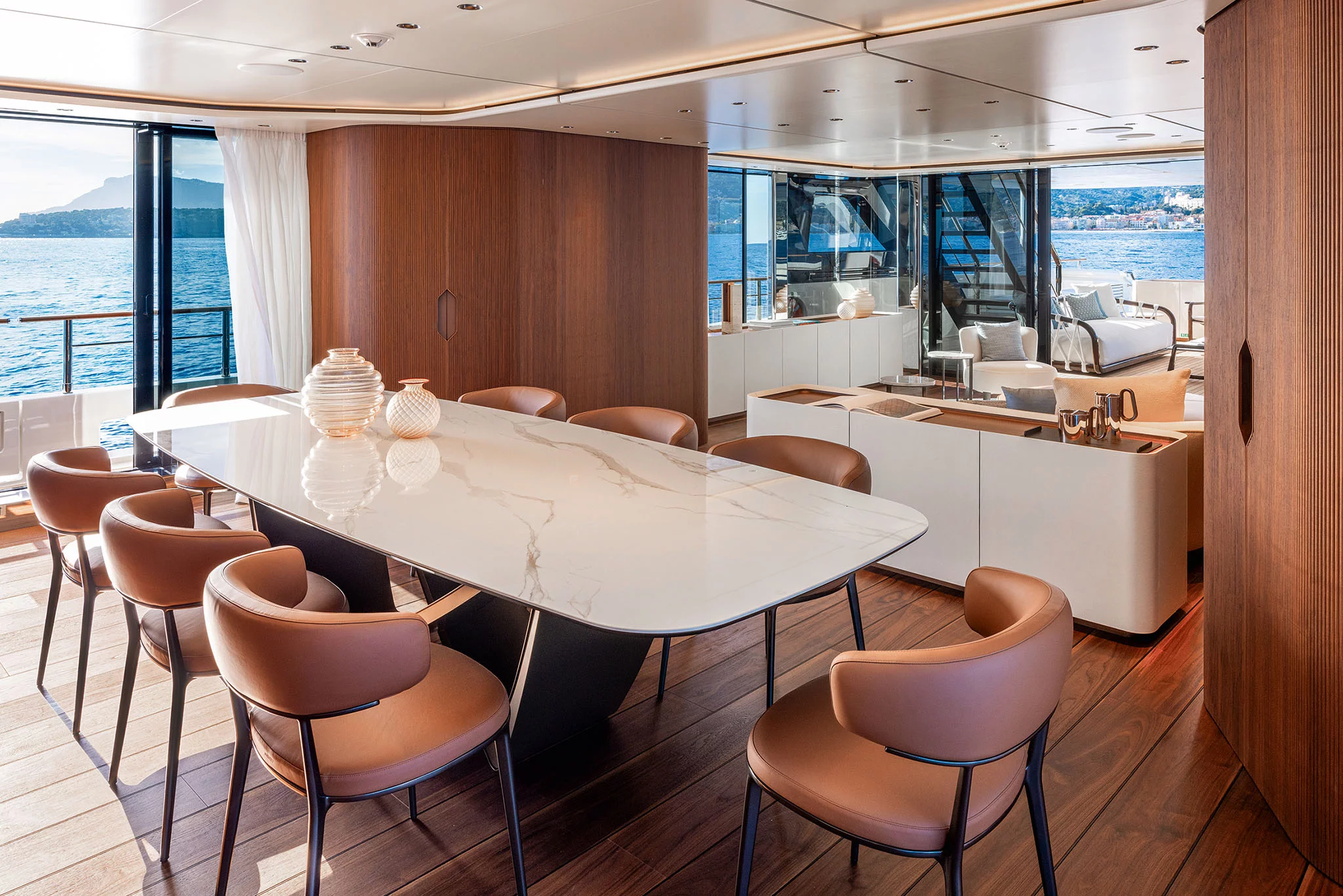 Spread across four decks, the Navetta 50 offers a master suite located at the bow of the upper deck, surrounded by floor-to-ceiling windows that provide 180-degree panoramic views and direct access to a spacious private terrace with a sundeck. The interior and exterior spaces are seamlessly connected, creating bright and open areas that enhance onboard comfort.