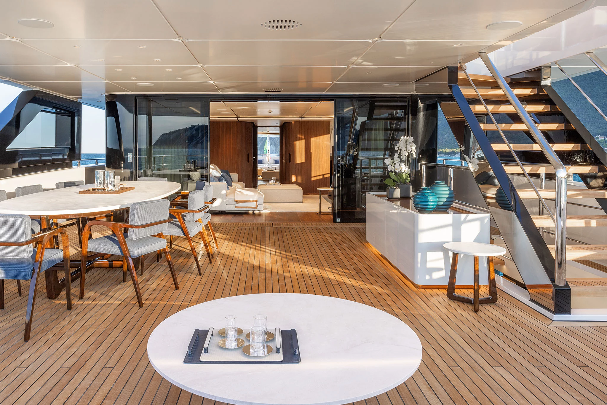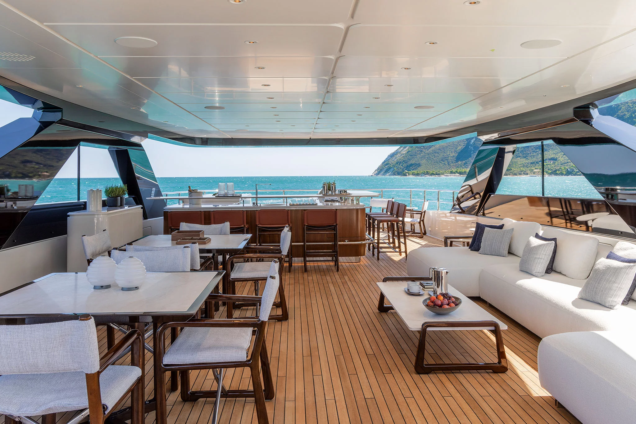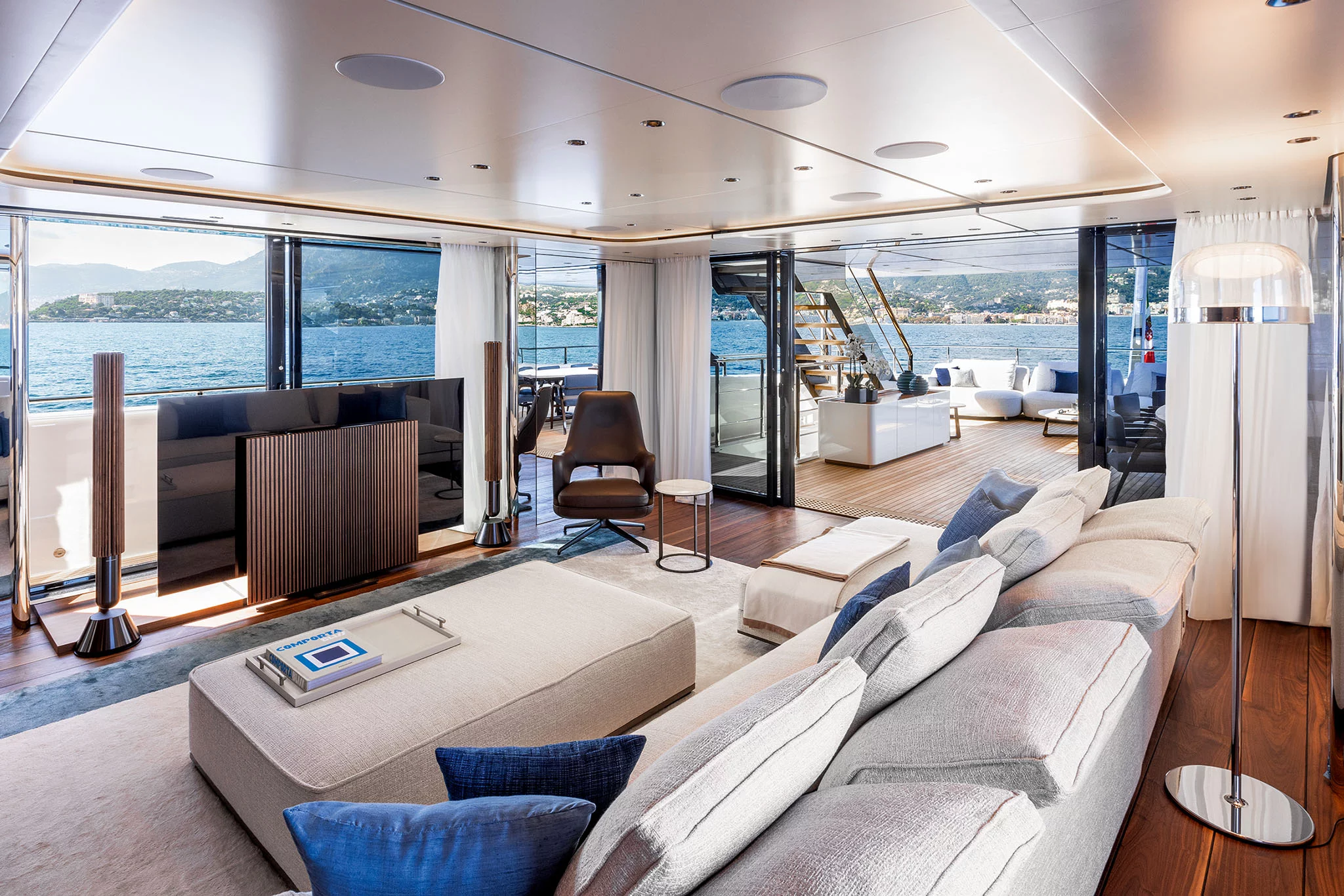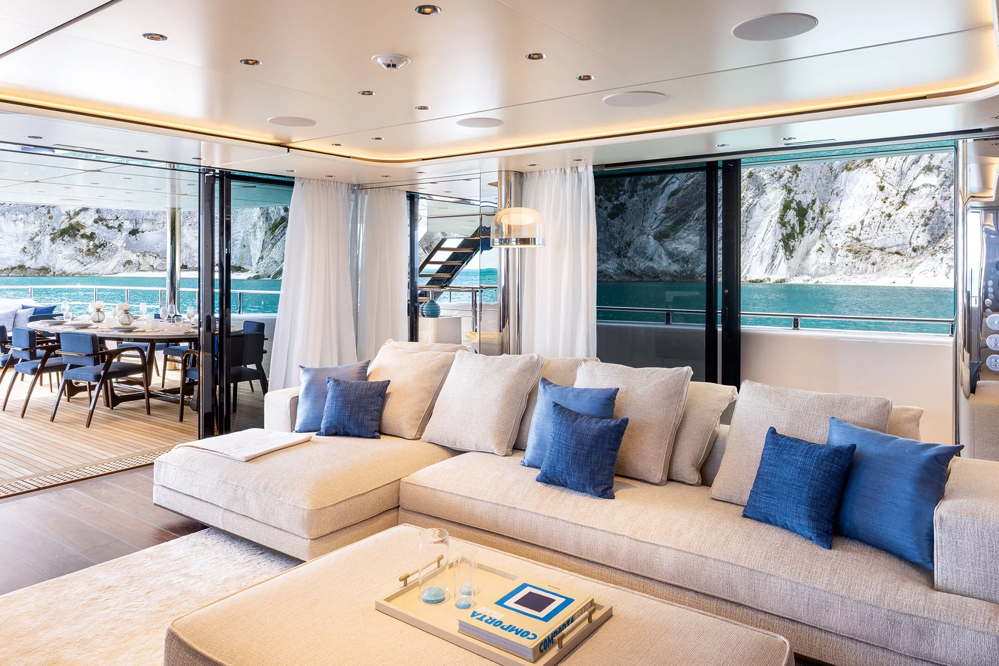 Spread across four decks, the Navetta 50 offers a master suite located at the bow of the upper deck, surrounded by floor-to-ceiling windows that provide 180-degree panoramic views and direct access to a spacious private terrace with a sundeck. The interior and exterior spaces are seamlessly connected, creating bright and open areas that enhance onboard comfort.