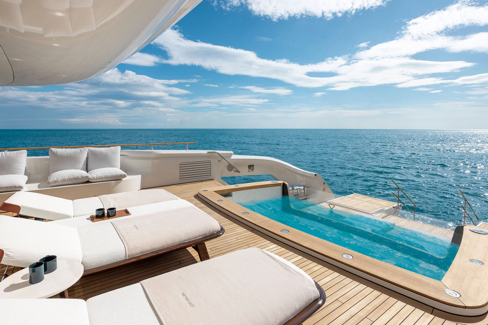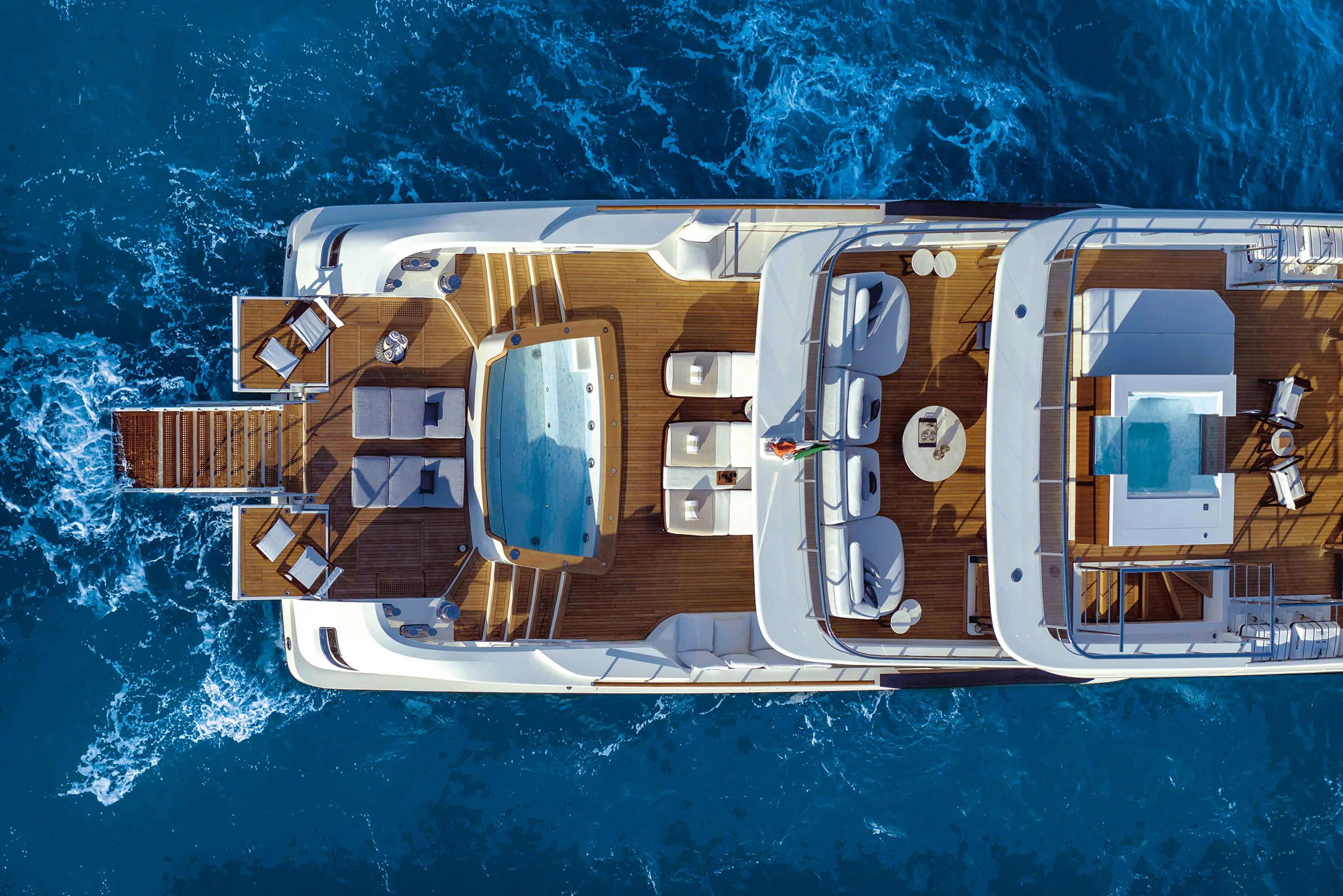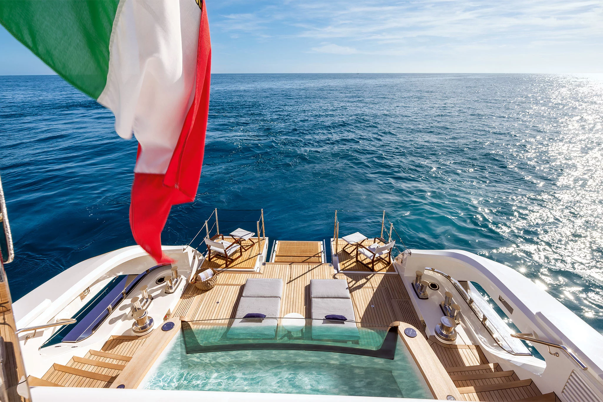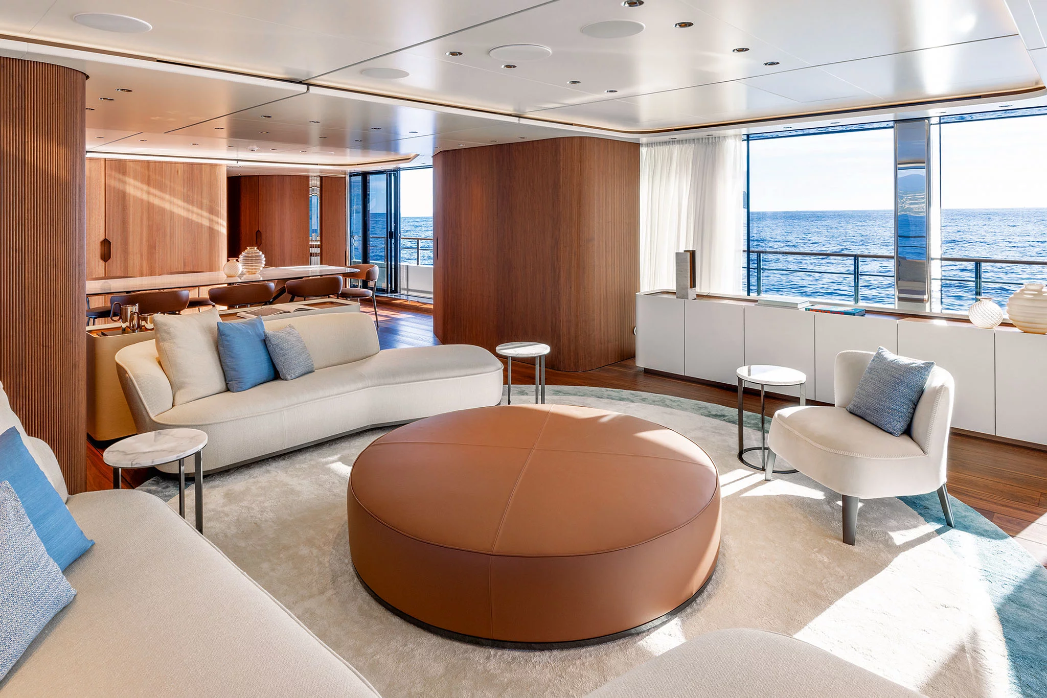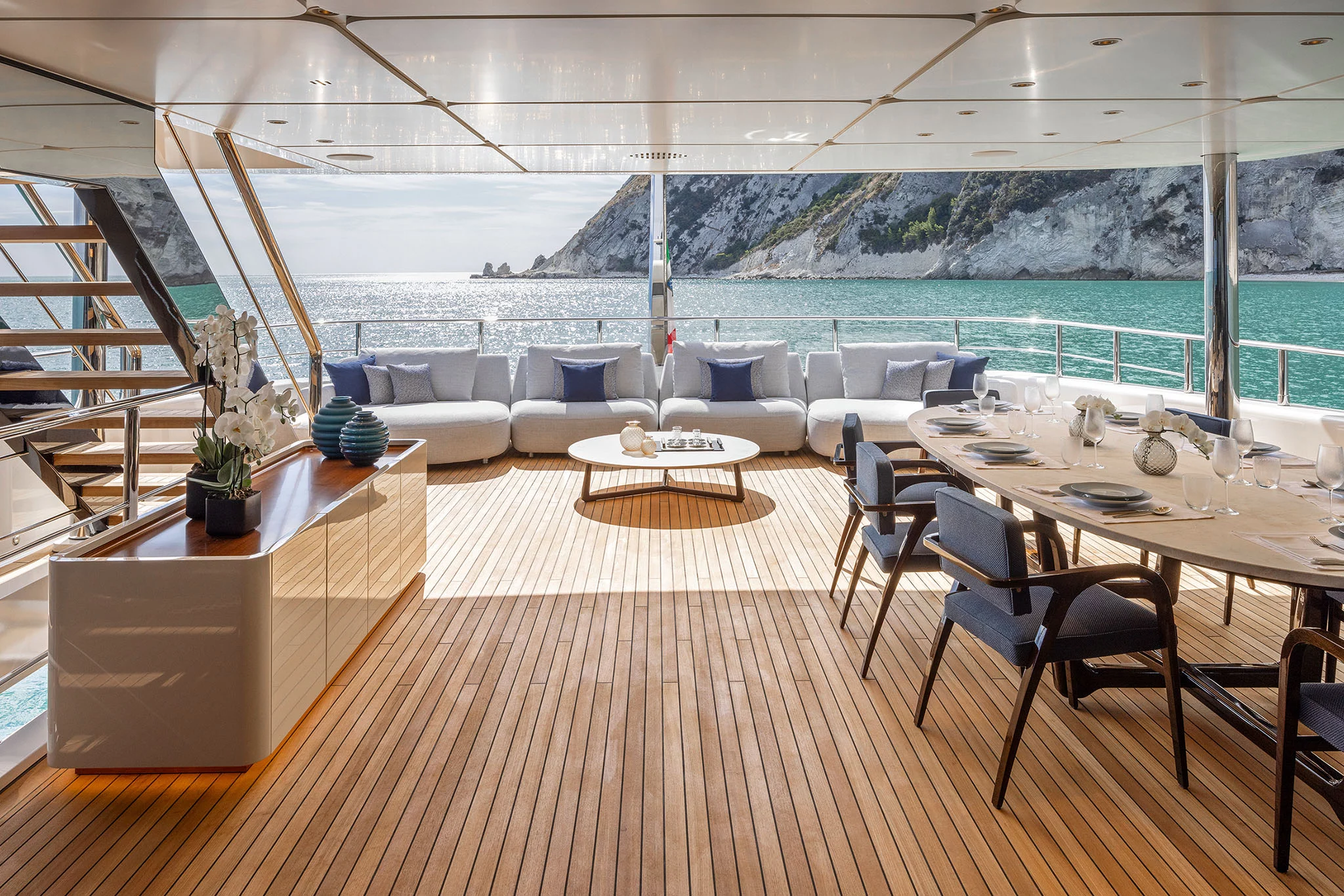 Spread across four decks, the Navetta 50 offers a master suite located at the bow of the upper deck, surrounded by floor-to-ceiling windows that provide 180-degree panoramic views and direct access to a spacious private terrace with a sundeck. The interior and exterior spaces are seamlessly connected, creating bright and open areas that enhance onboard comfort.