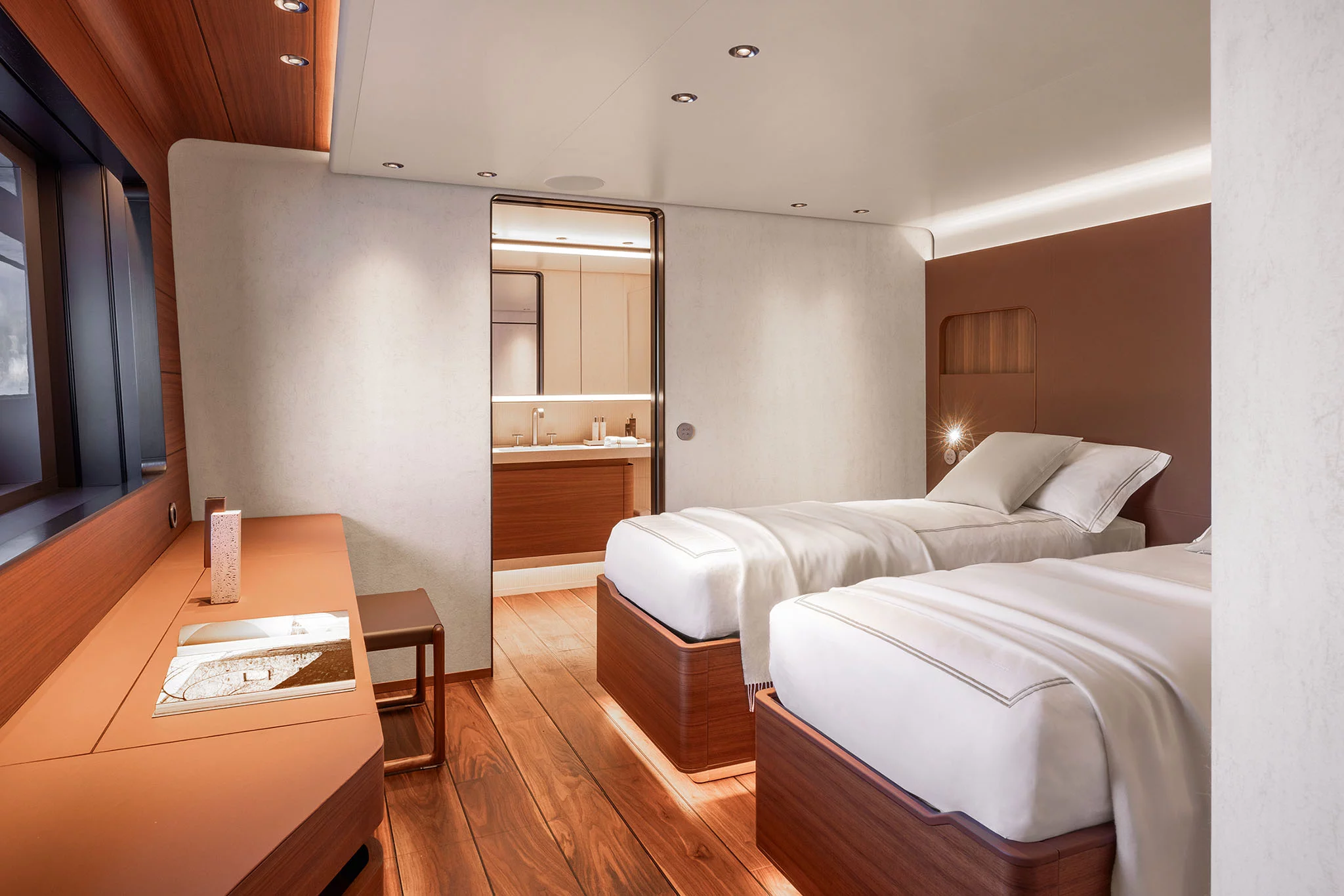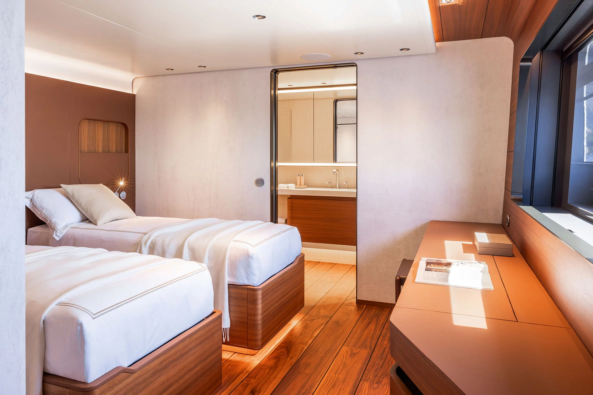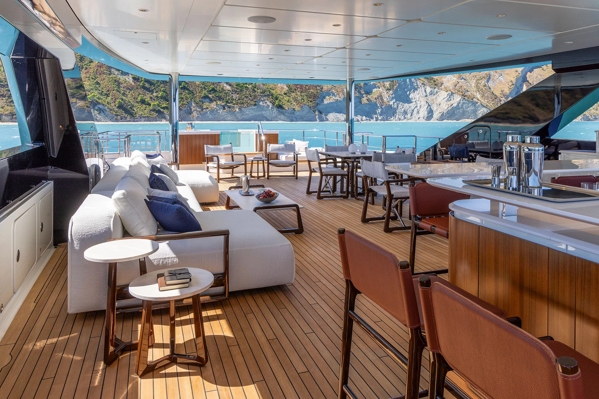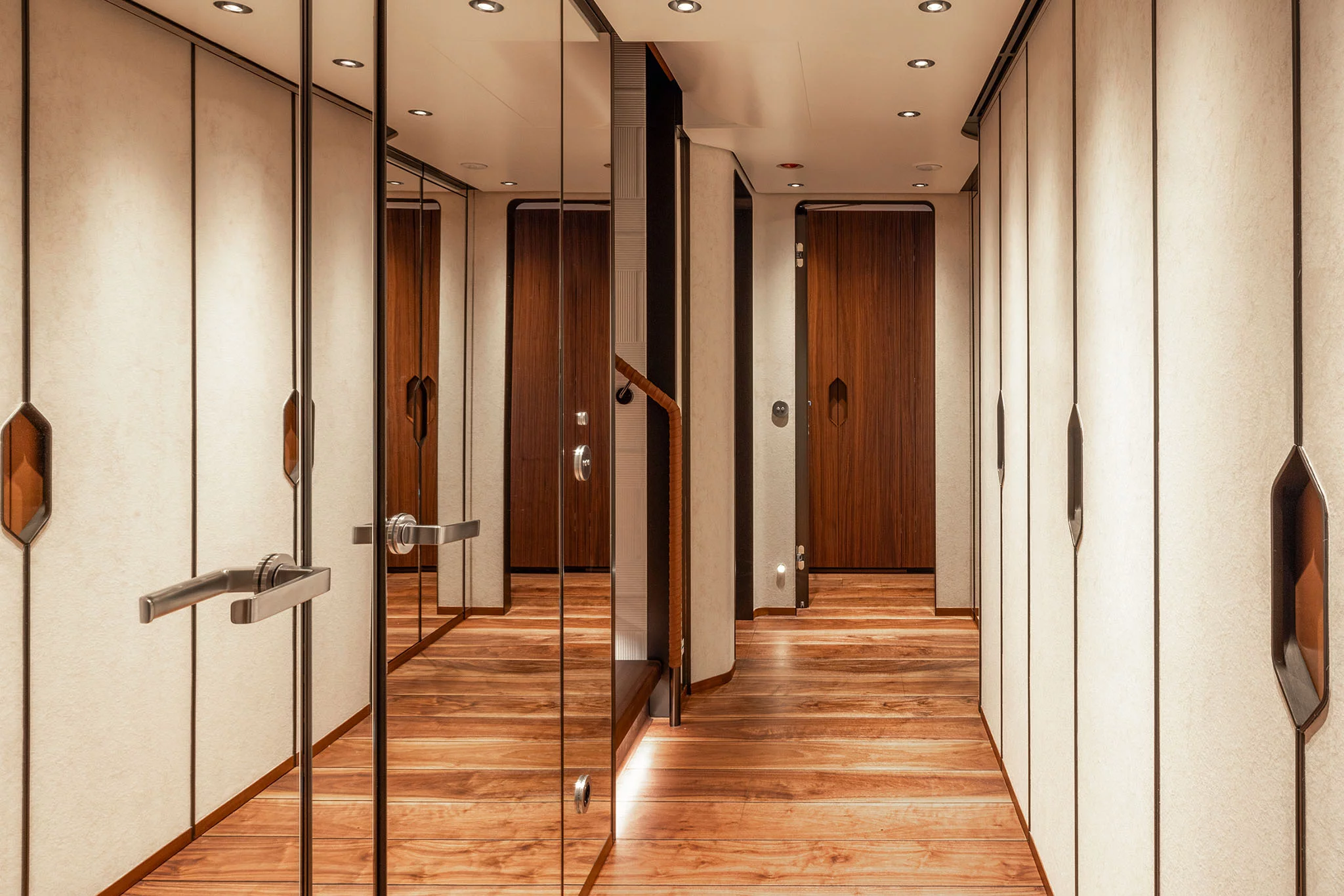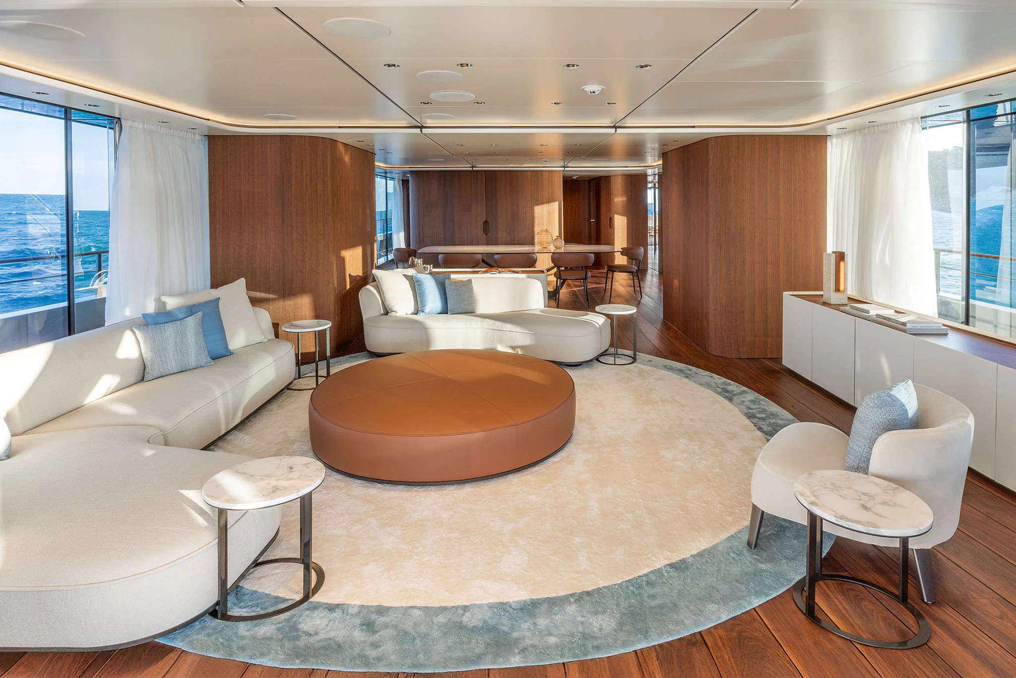 Spread across four decks, the Navetta 50 offers a master suite located at the bow of the upper deck, surrounded by floor-to-ceiling windows that provide 180-degree panoramic views and direct access to a spacious private terrace with a sundeck. The interior and exterior spaces are seamlessly connected, creating bright and open areas that enhance onboard comfort.