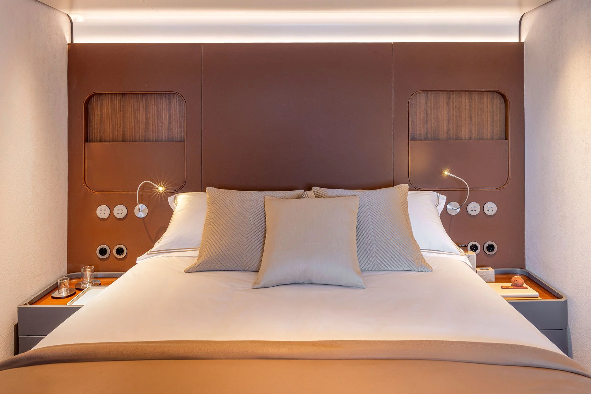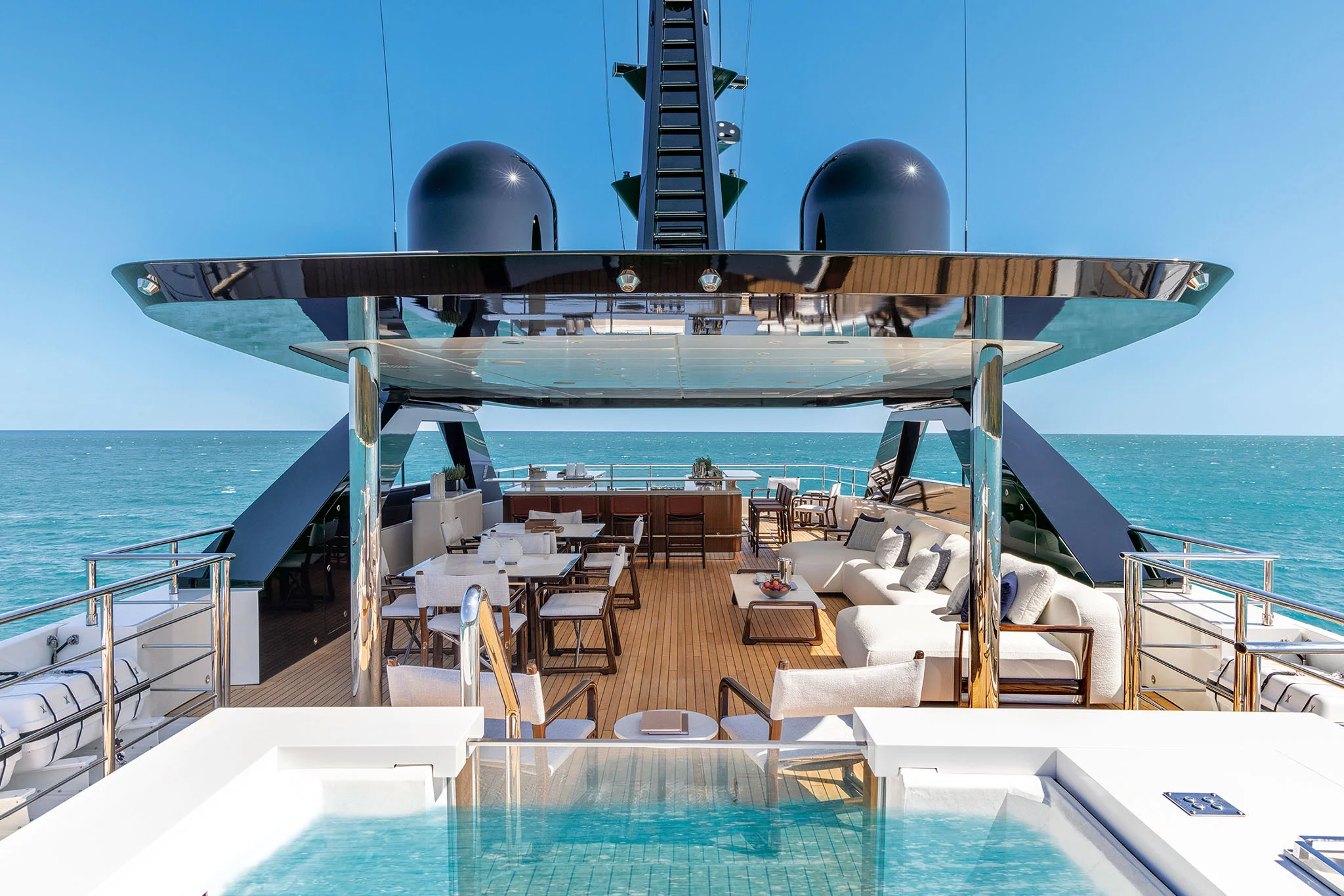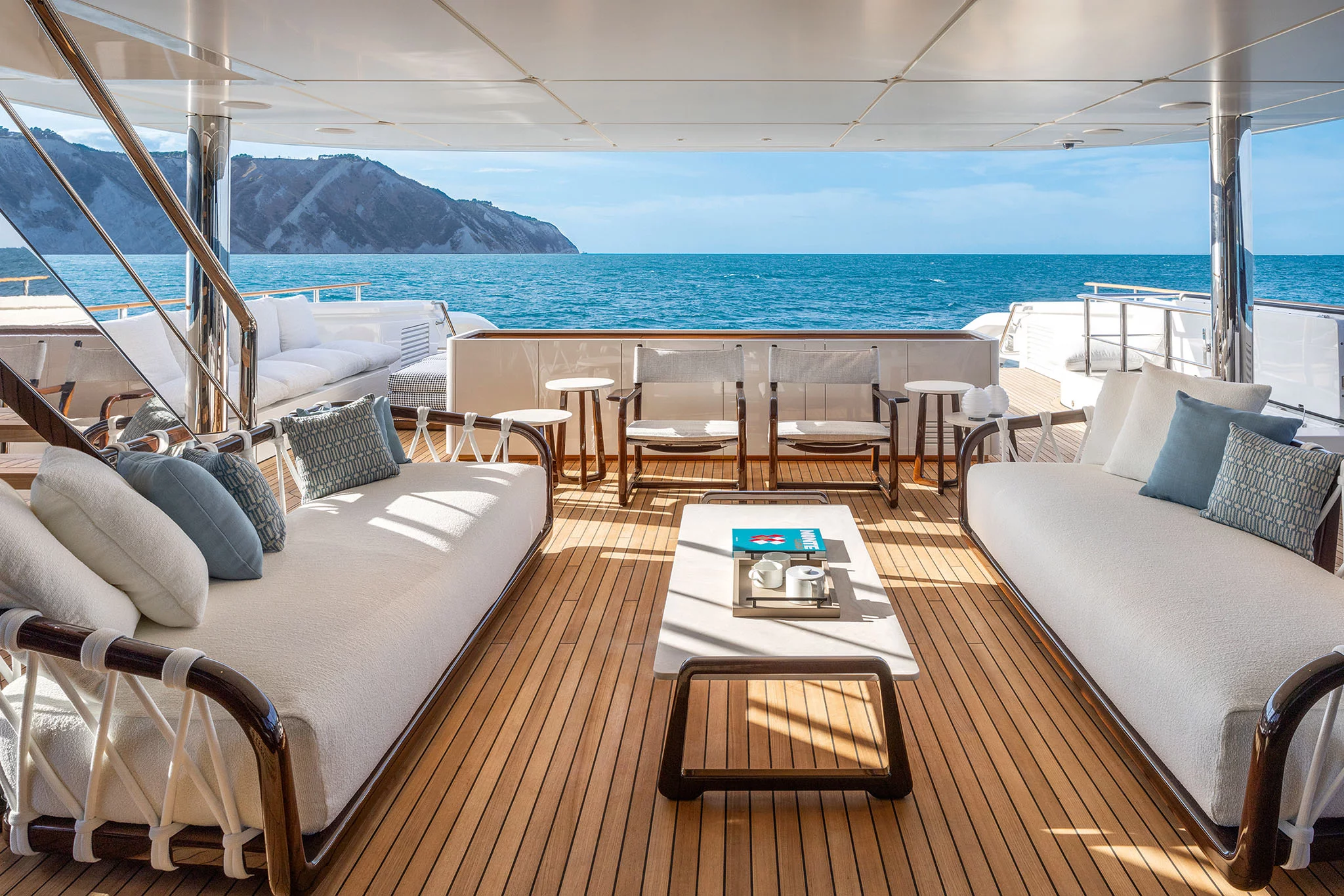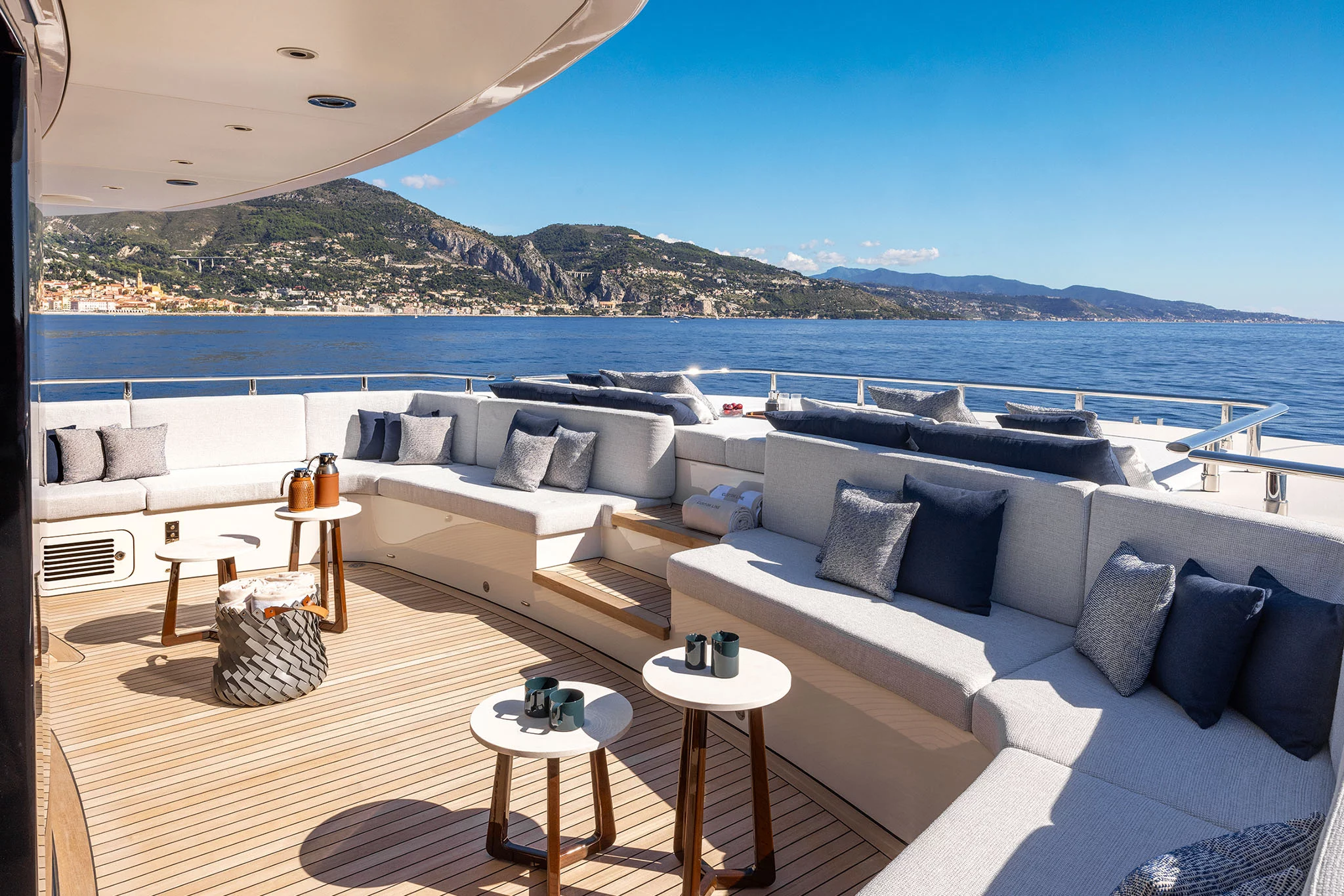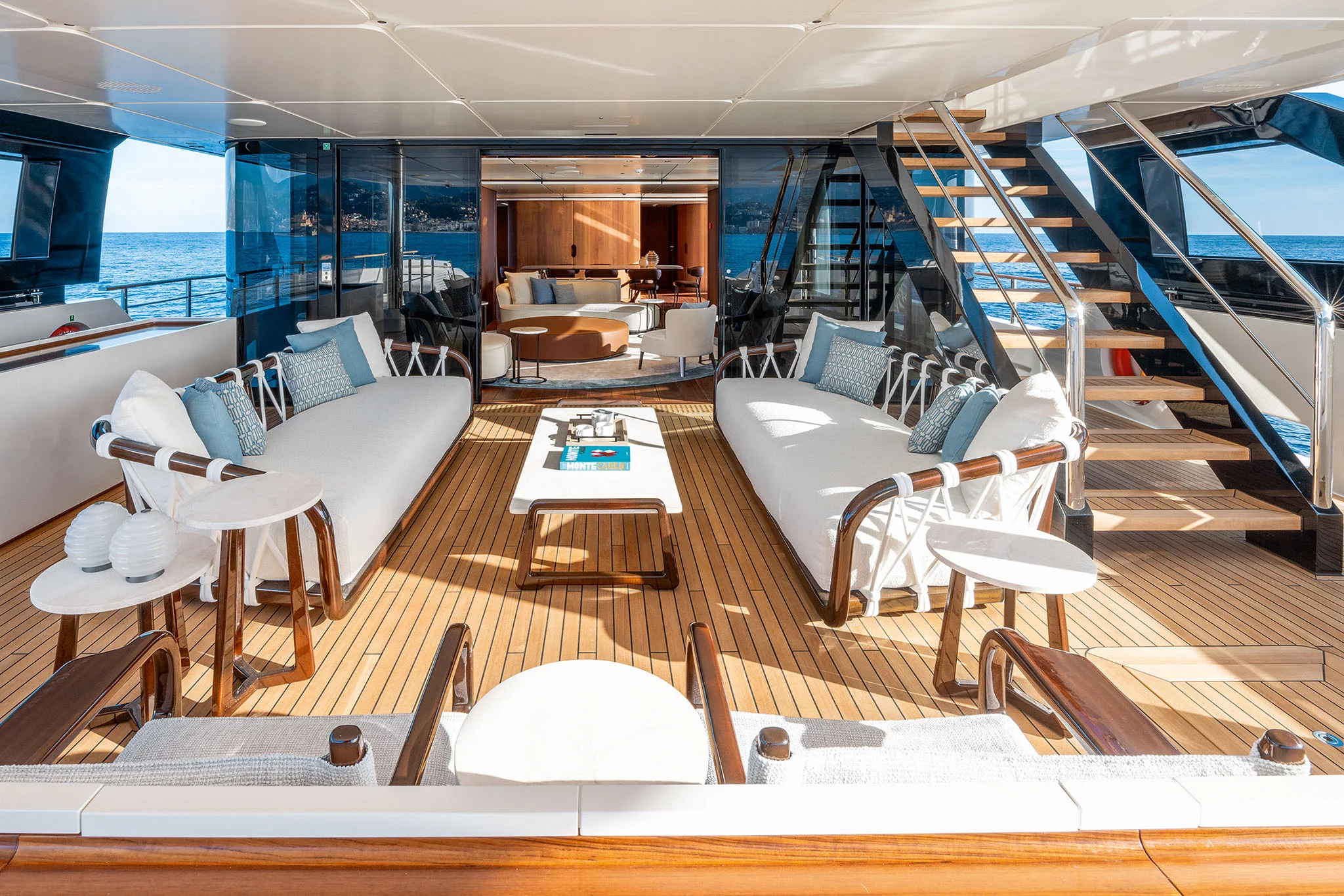 Spread across four decks, the Navetta 50 offers a master suite located at the bow of the upper deck, surrounded by floor-to-ceiling windows that provide 180-degree panoramic views and direct access to a spacious private terrace with a sundeck. The interior and exterior spaces are seamlessly connected, creating bright and open areas that enhance onboard comfort.