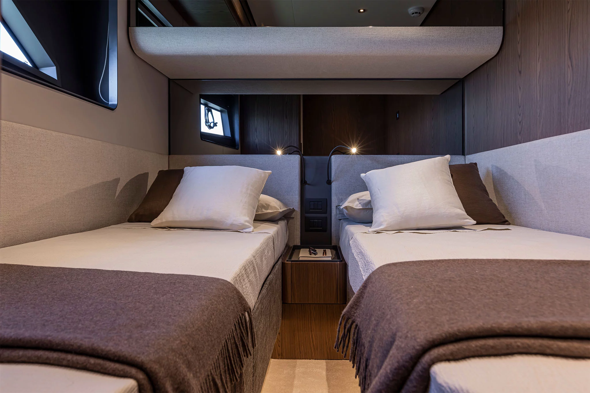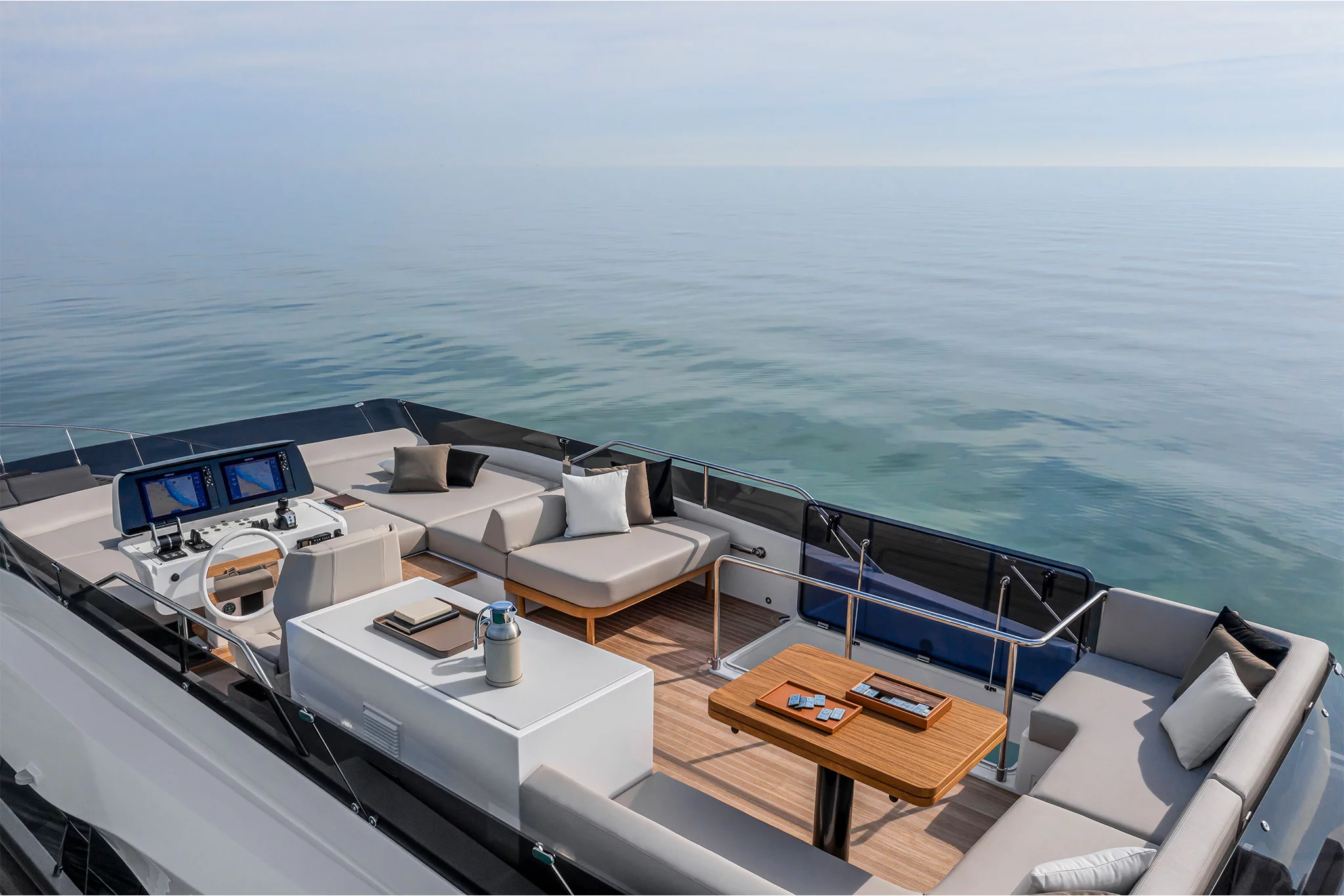 The expansive exterior features a generous flybridge and a bow area designed for relaxation, while the interior boasts high-quality finishes, soft tones, and an abundance of natural light. With three spacious cabins and well-distributed social areas, the yacht is ideal for long voyages or moments of leisure.