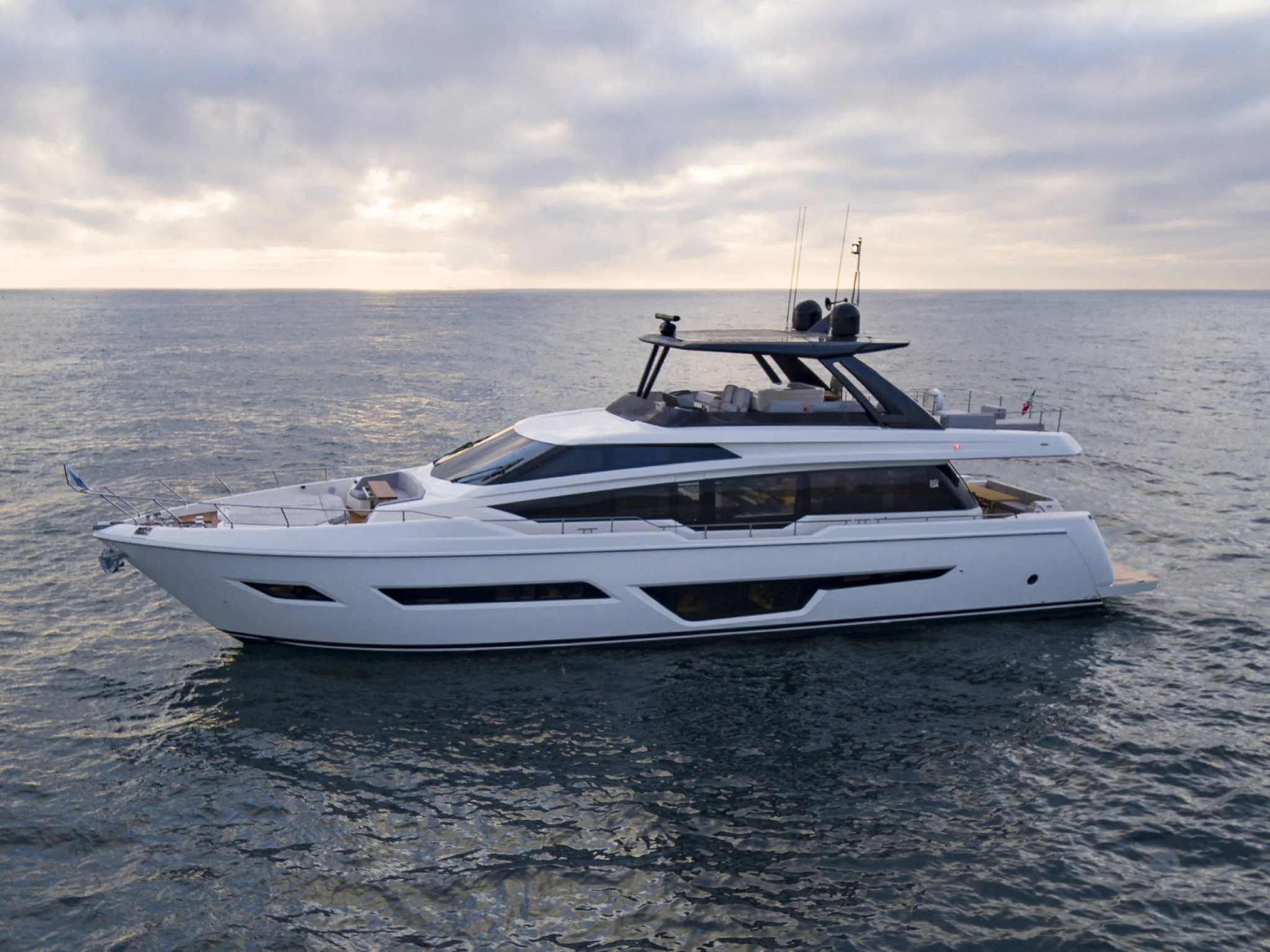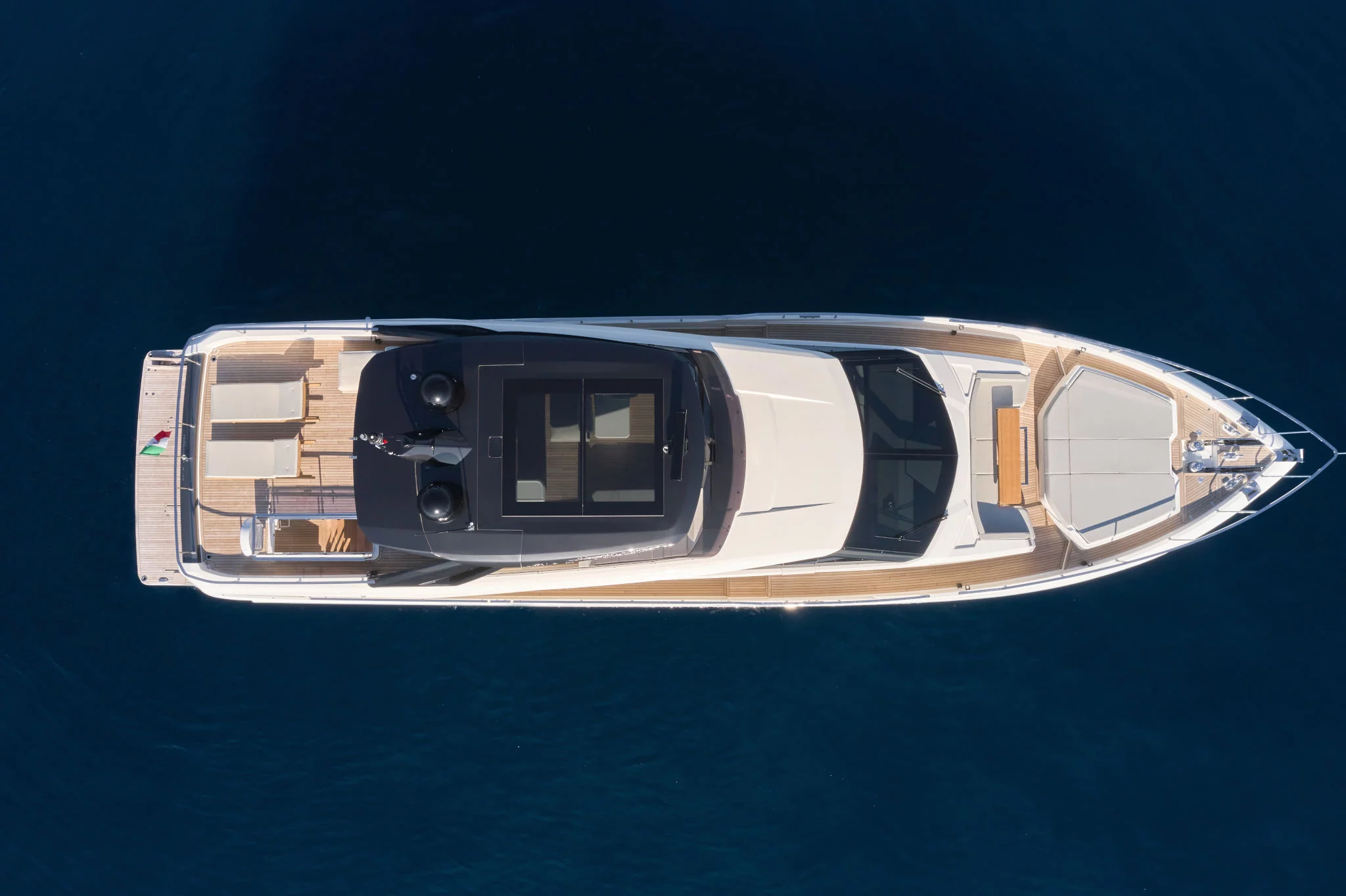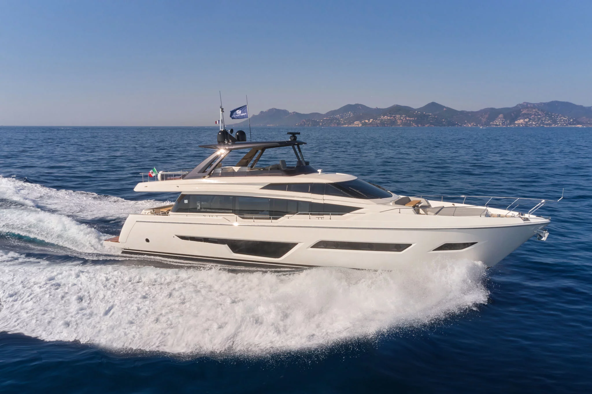 The Ferretti Yachts 780 is a luxury yacht measuring 24.01 metres in length with a maximum beam of 5.8 metres, combining aerodynamic design with comfort and safety at sea. Following a recent restyling, it features large glazed surfaces on the hull, giving it a sportier profile.