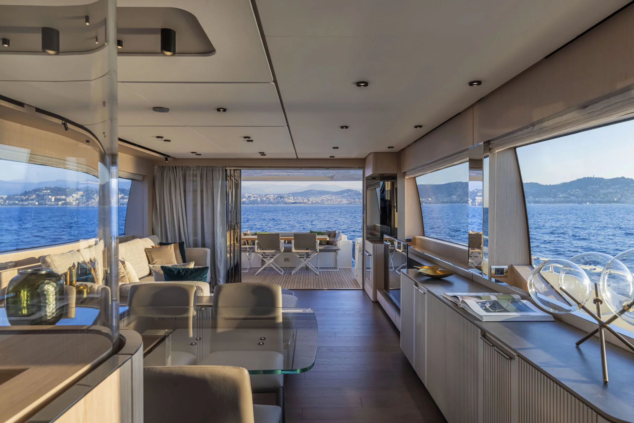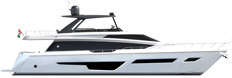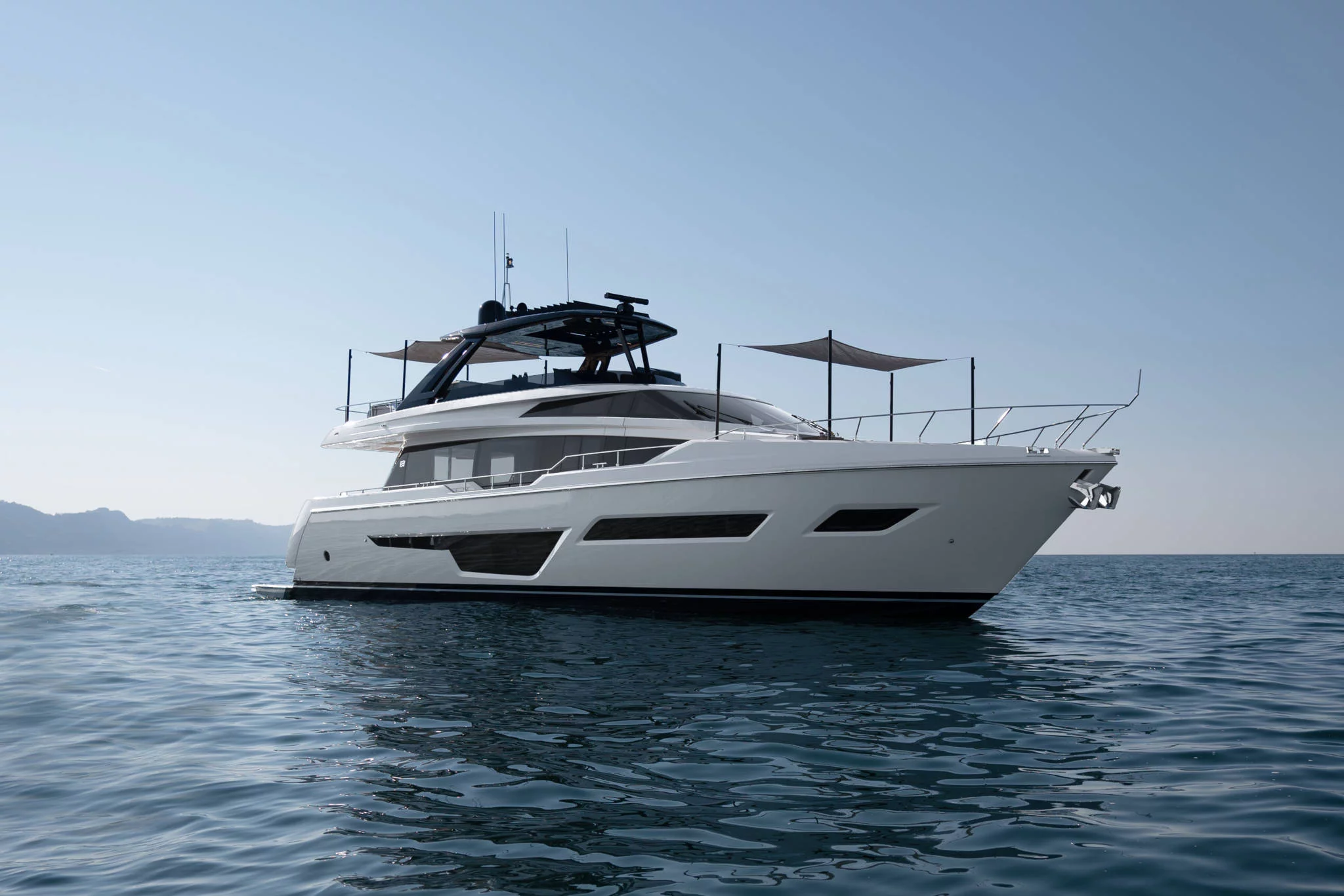 The Ferretti Yachts 780 is a luxury yacht measuring 24.01 metres in length with a maximum beam of 5.8 metres, combining aerodynamic design with comfort and safety at sea. Following a recent restyling, it features large glazed surfaces on the hull, giving it a sportier profile.