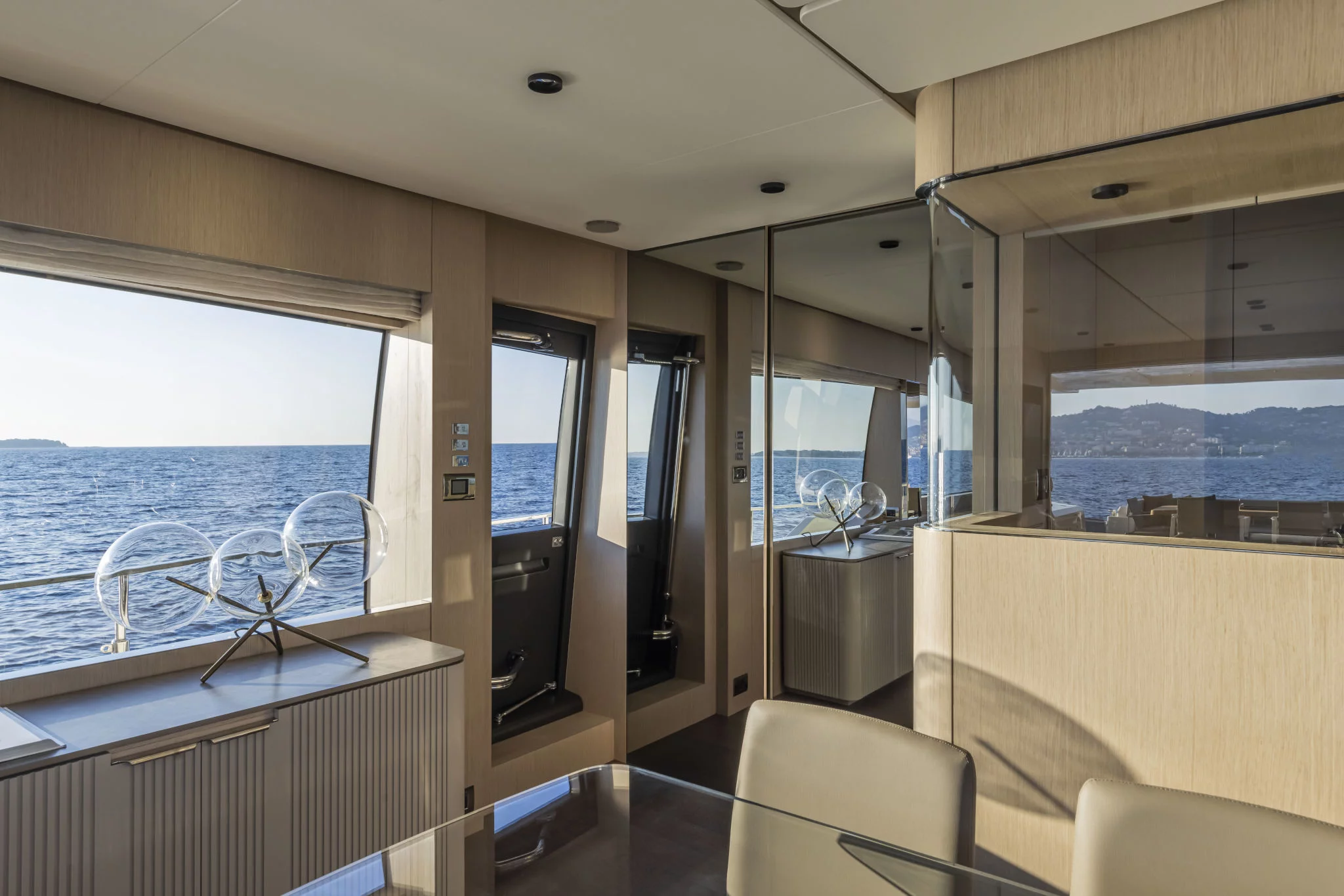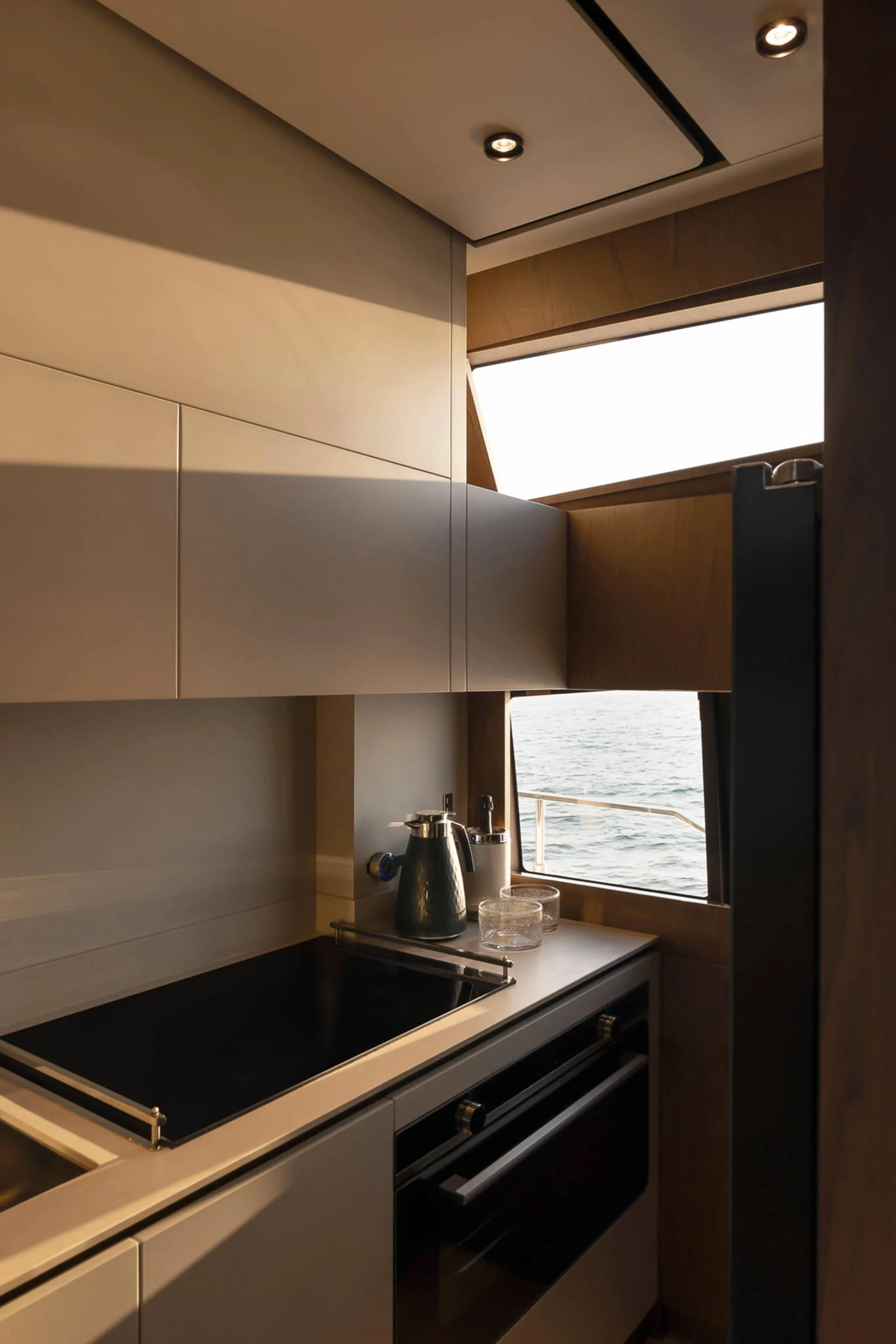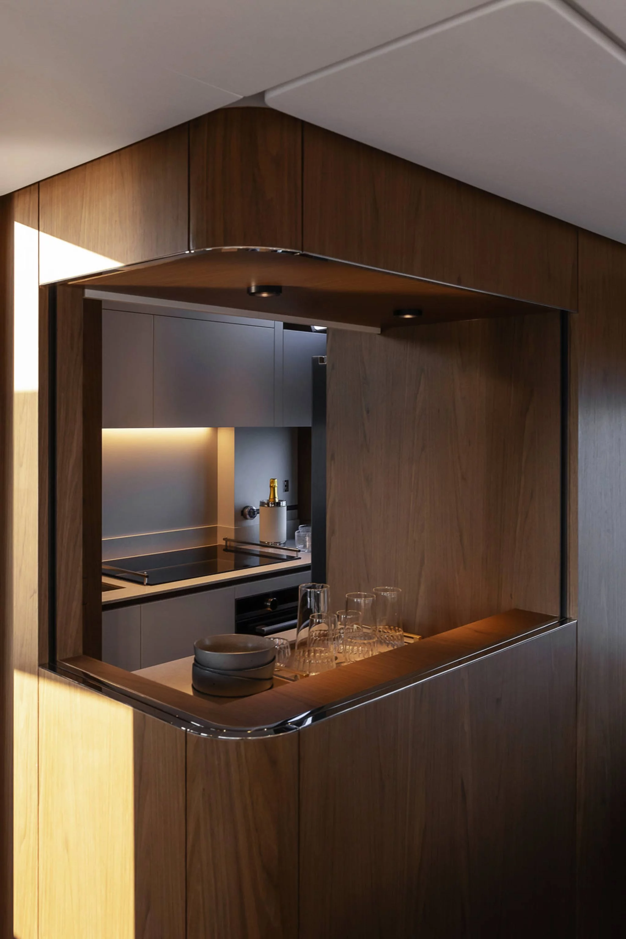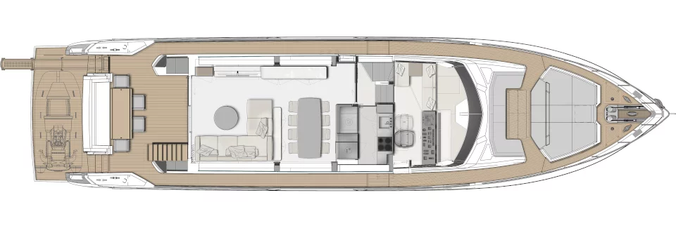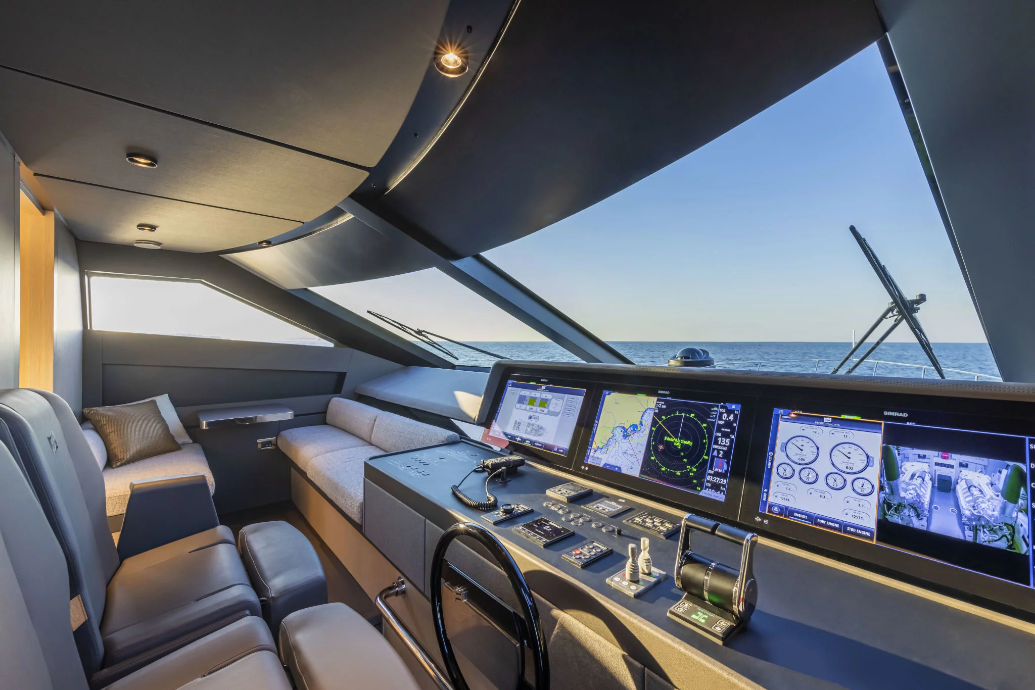 The spacious flybridge, built from carbon fibre and composites, can be equipped with an optional modular hardtop, offering choices such as a fixed window, built-in bimini, or adjustable louvers.