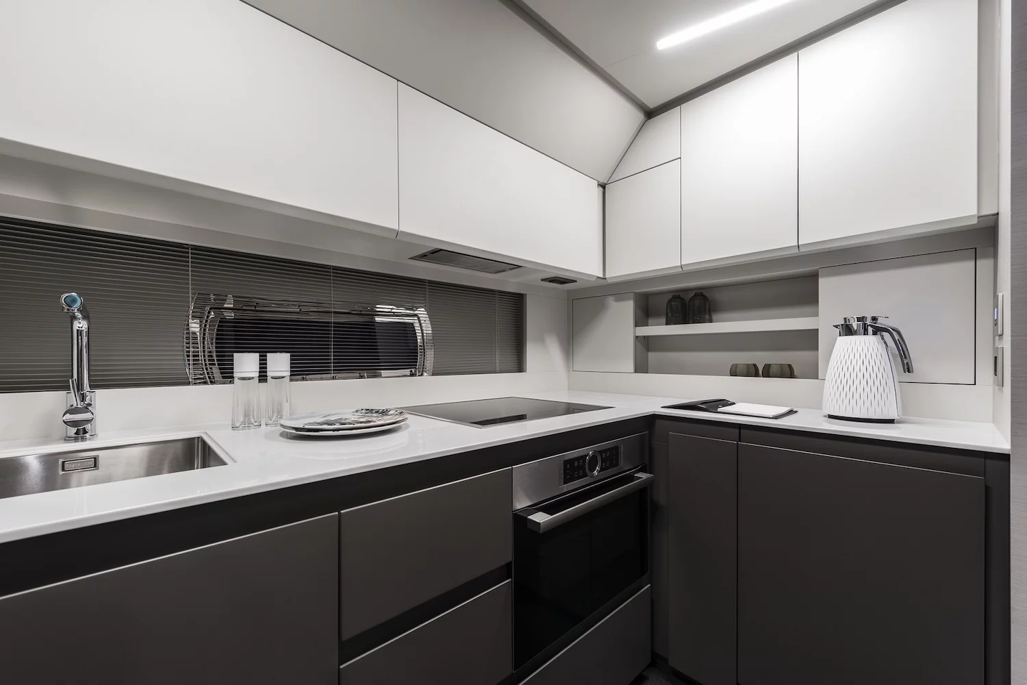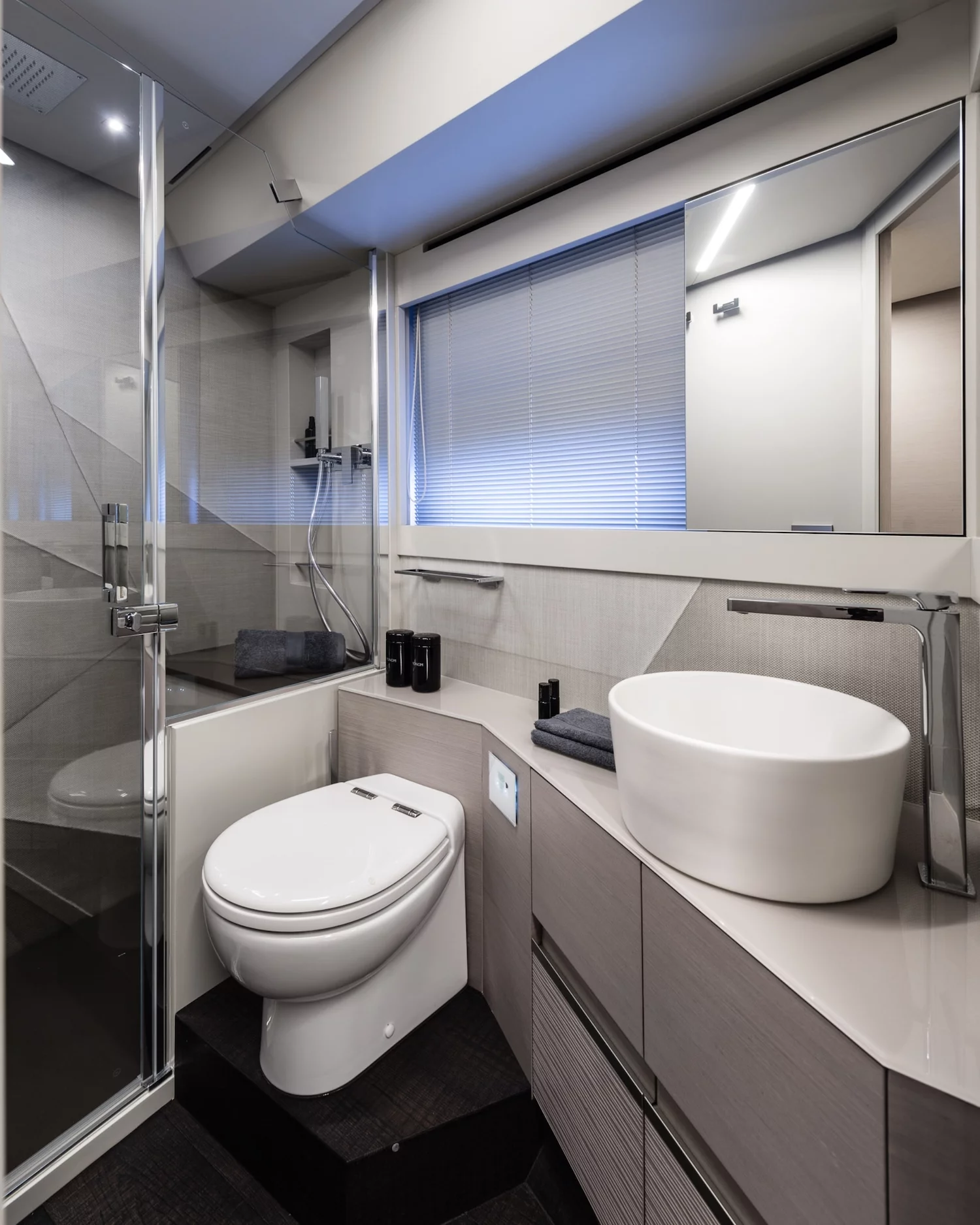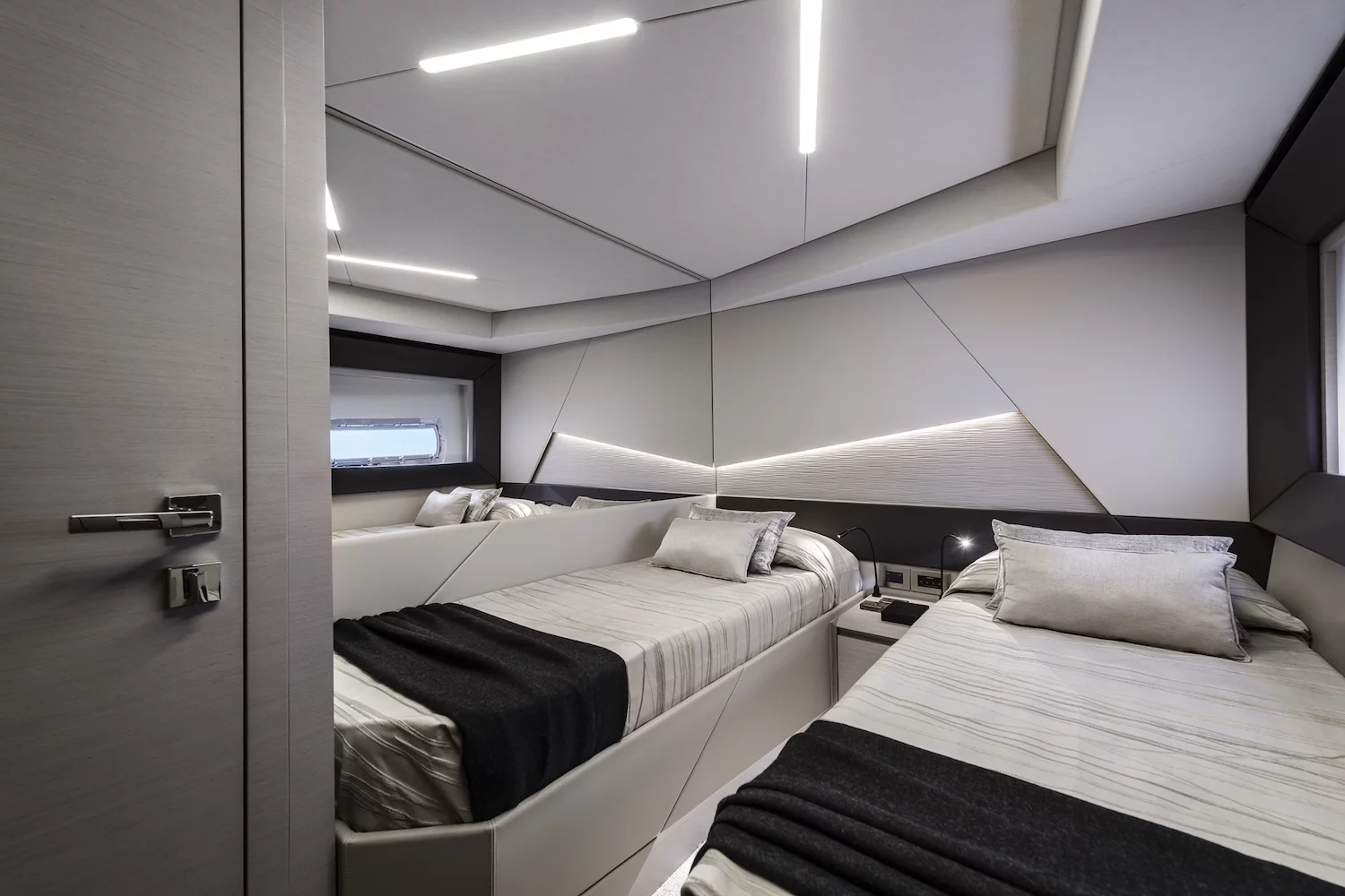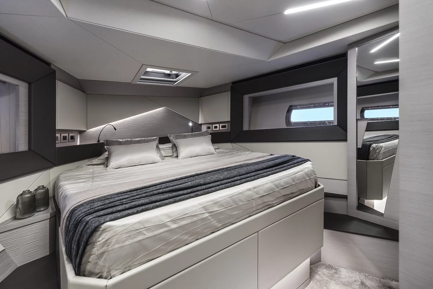 The sleek exterior features sporty lines, distinctive lateral wings, and an exclusive hull and superstructure colour.