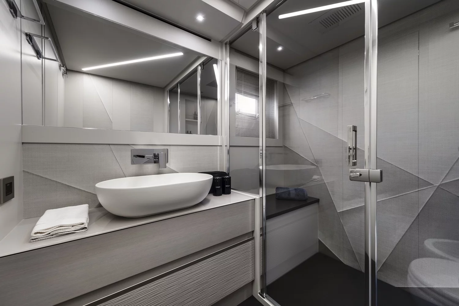 The interior includes three spacious cabins, each with an en-suite bathroom, and large panoramic windows that fill the spaces with natural light. Advanced technologies, such as the Dynamic Positioning System and integrated navigation controls, ensure precise handling and safety.
